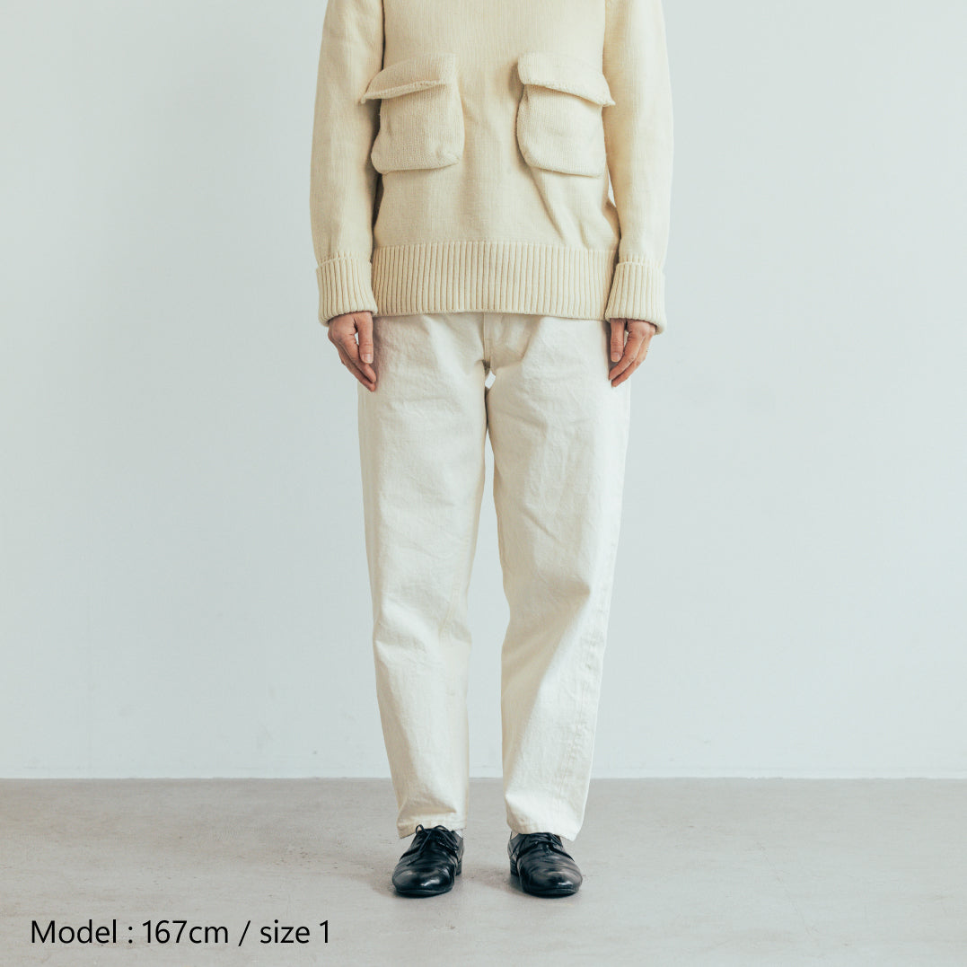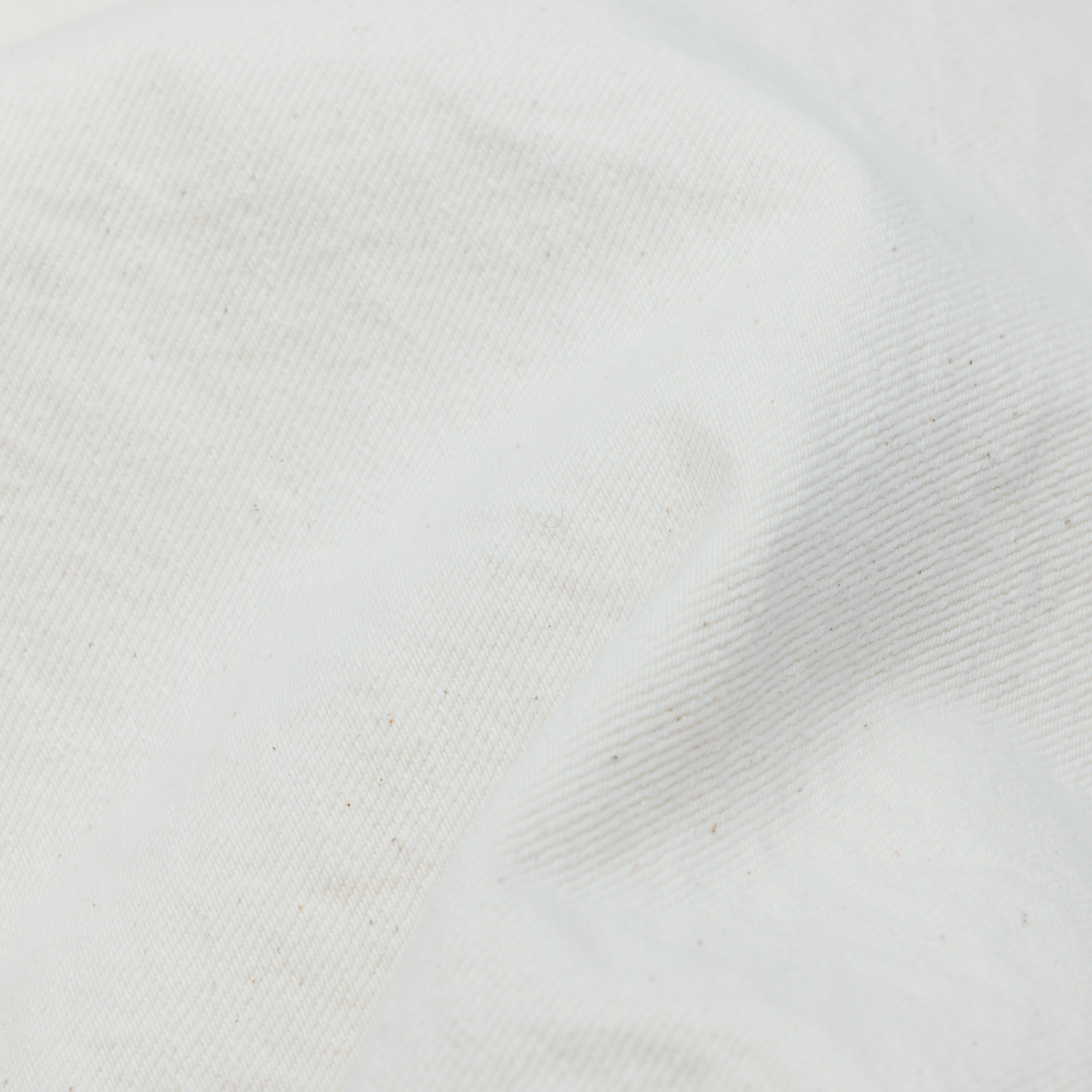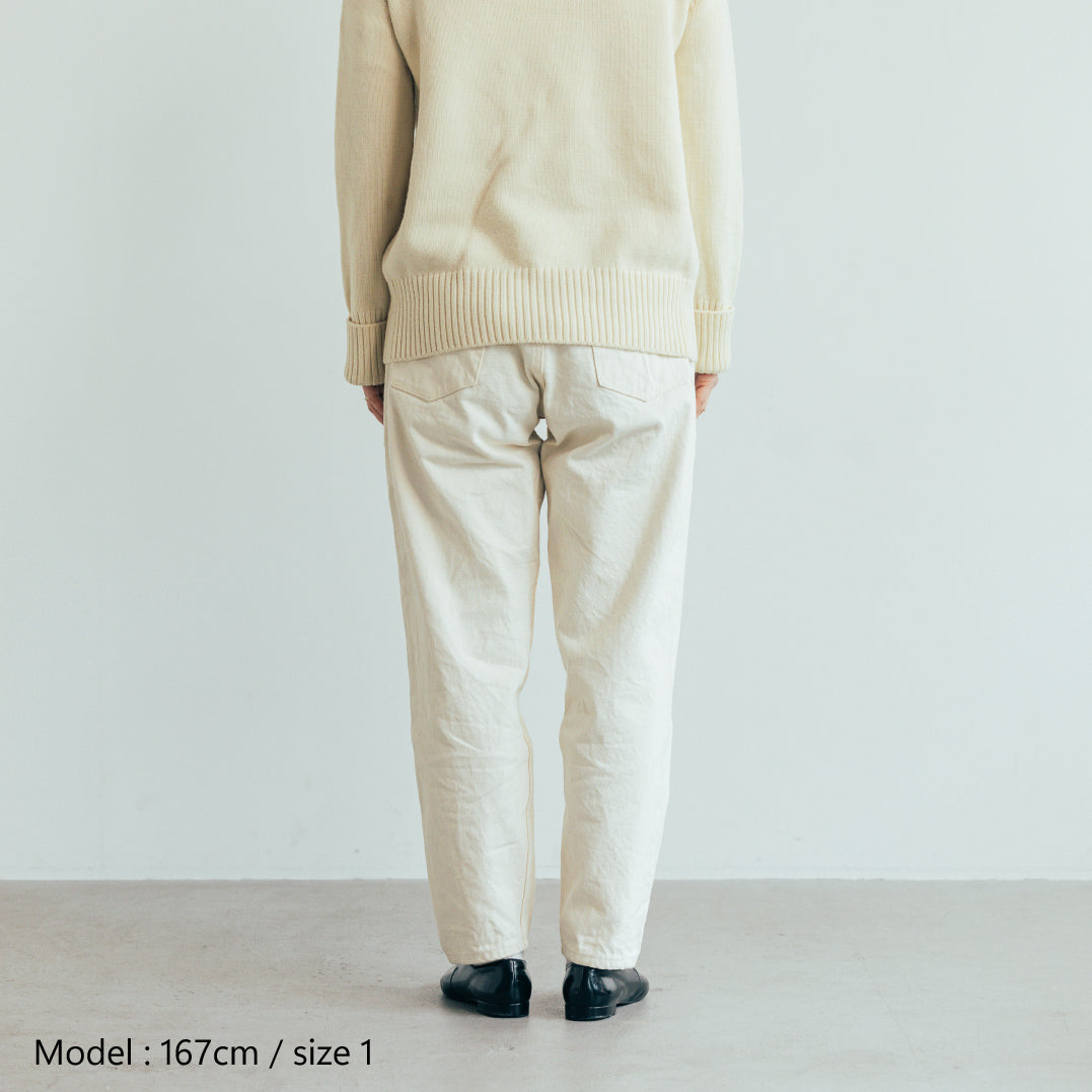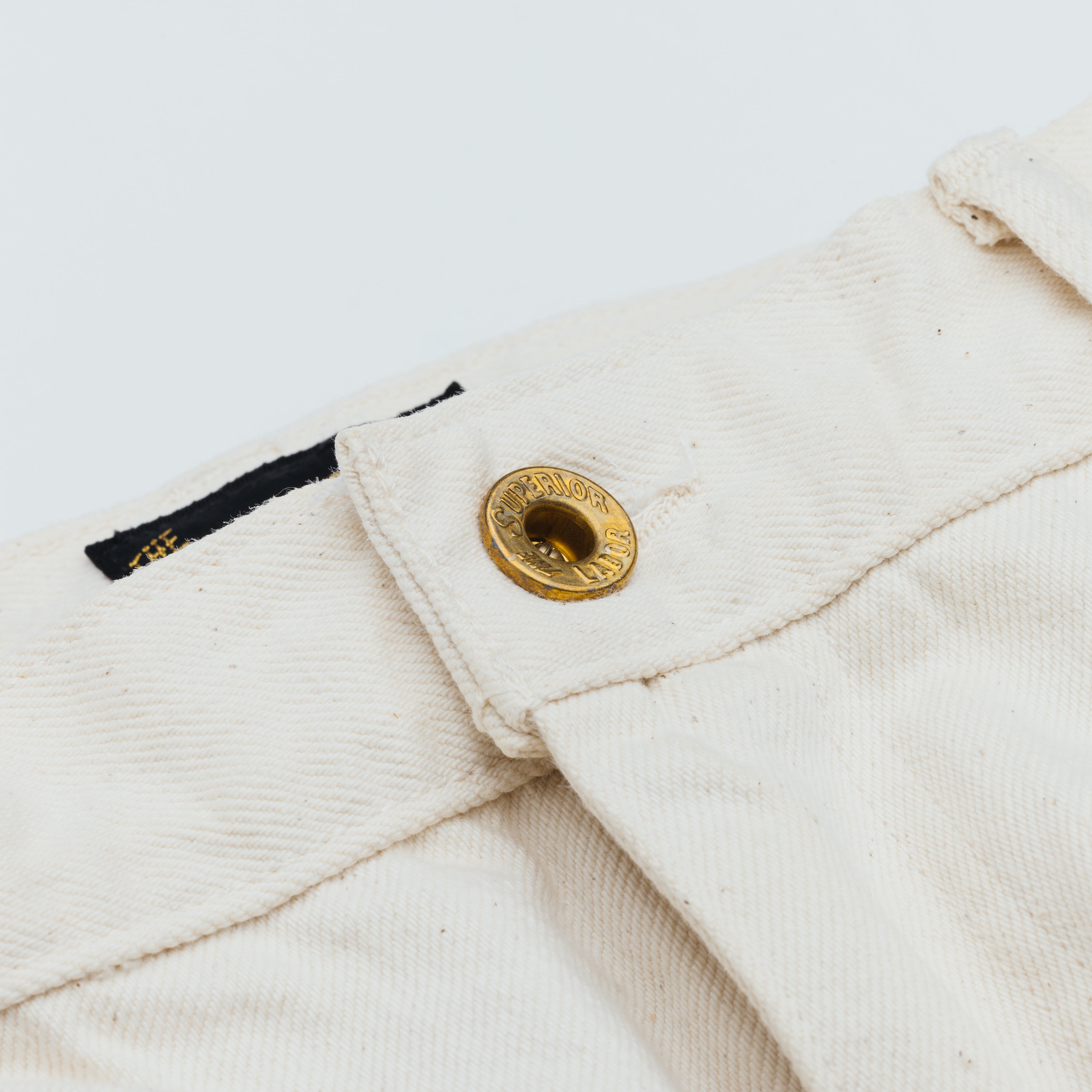 These bottoms are made from natural undyed selvedge denim fabric produced in Okayama, woven with raw yarns for both the warp and weft, leaving in natural cotton flecks.