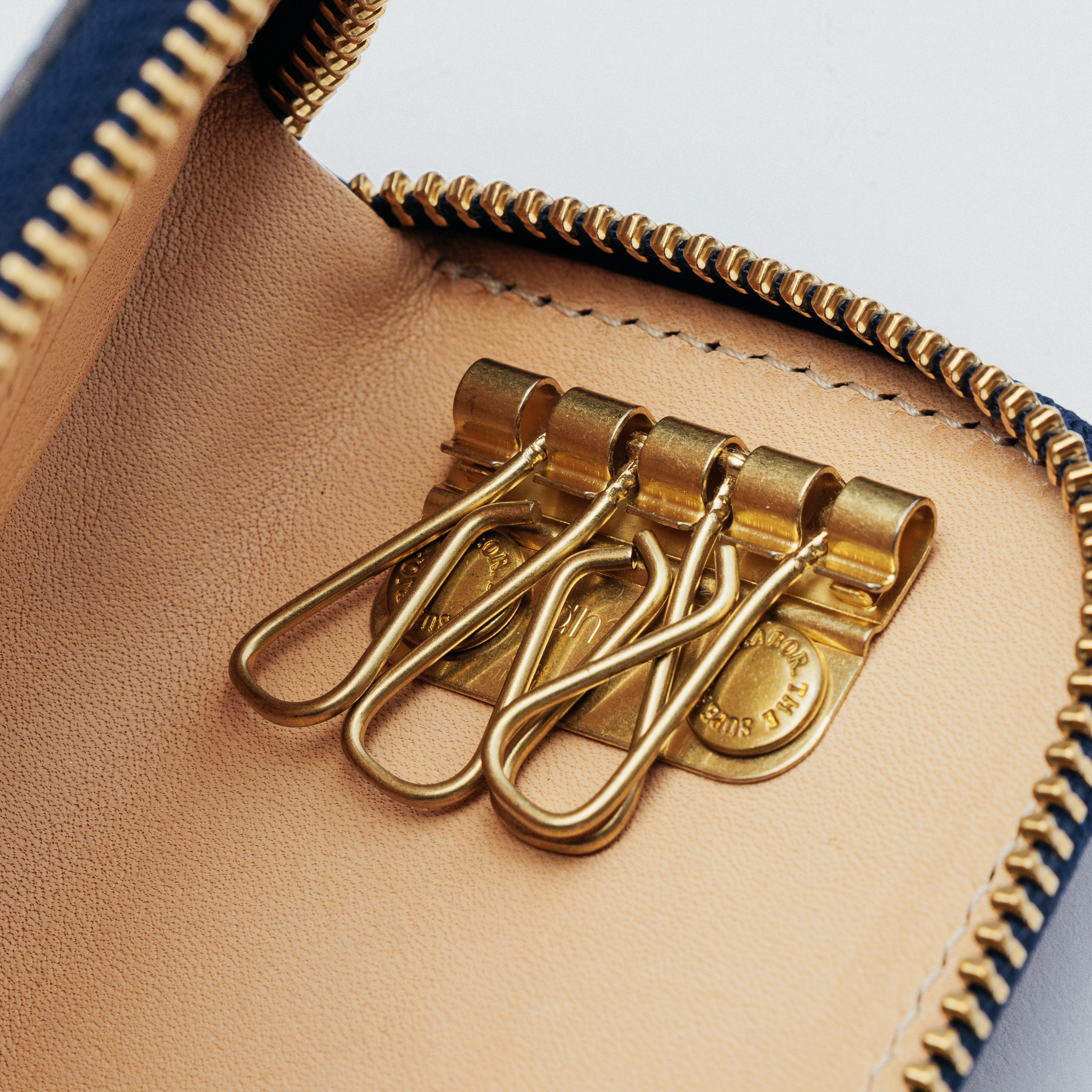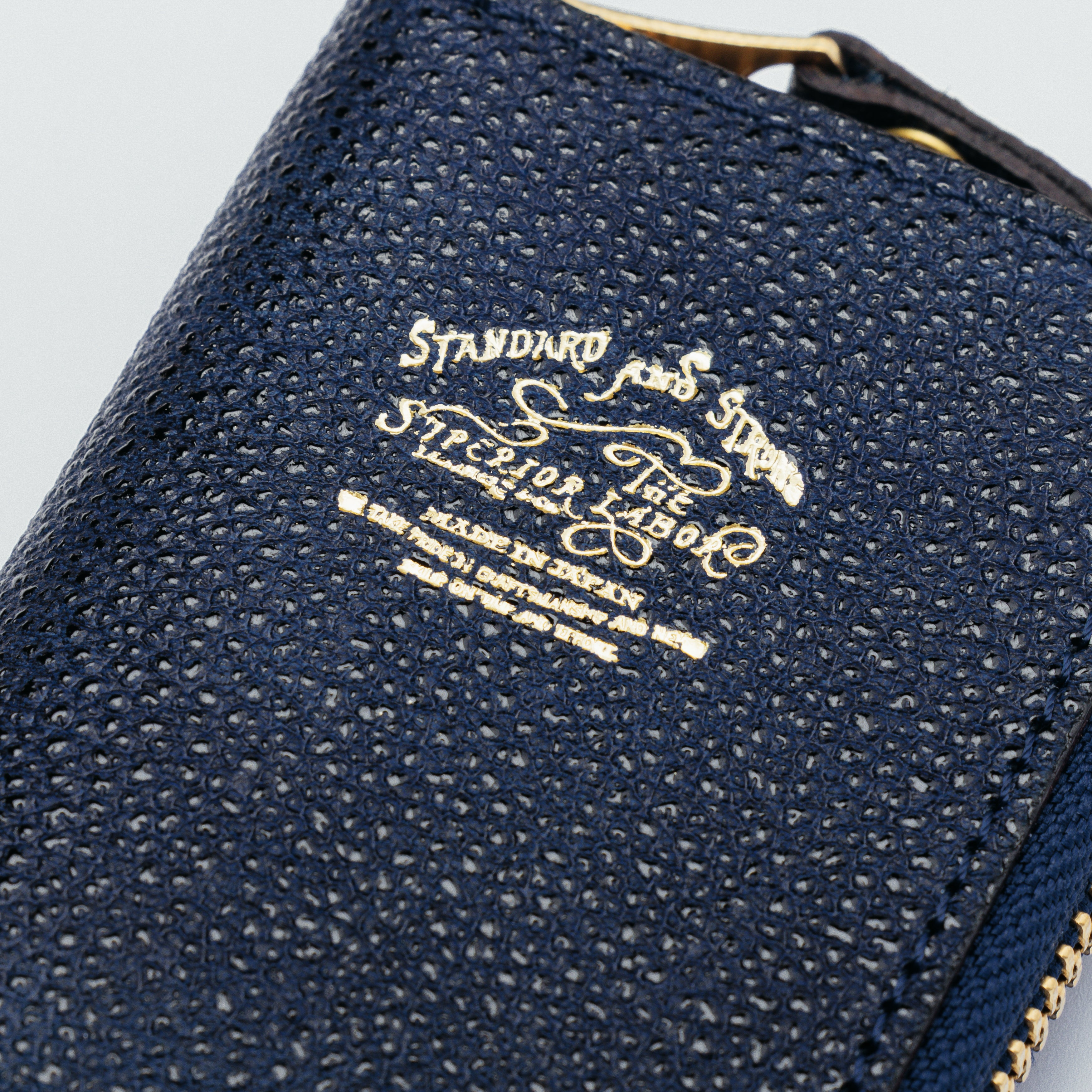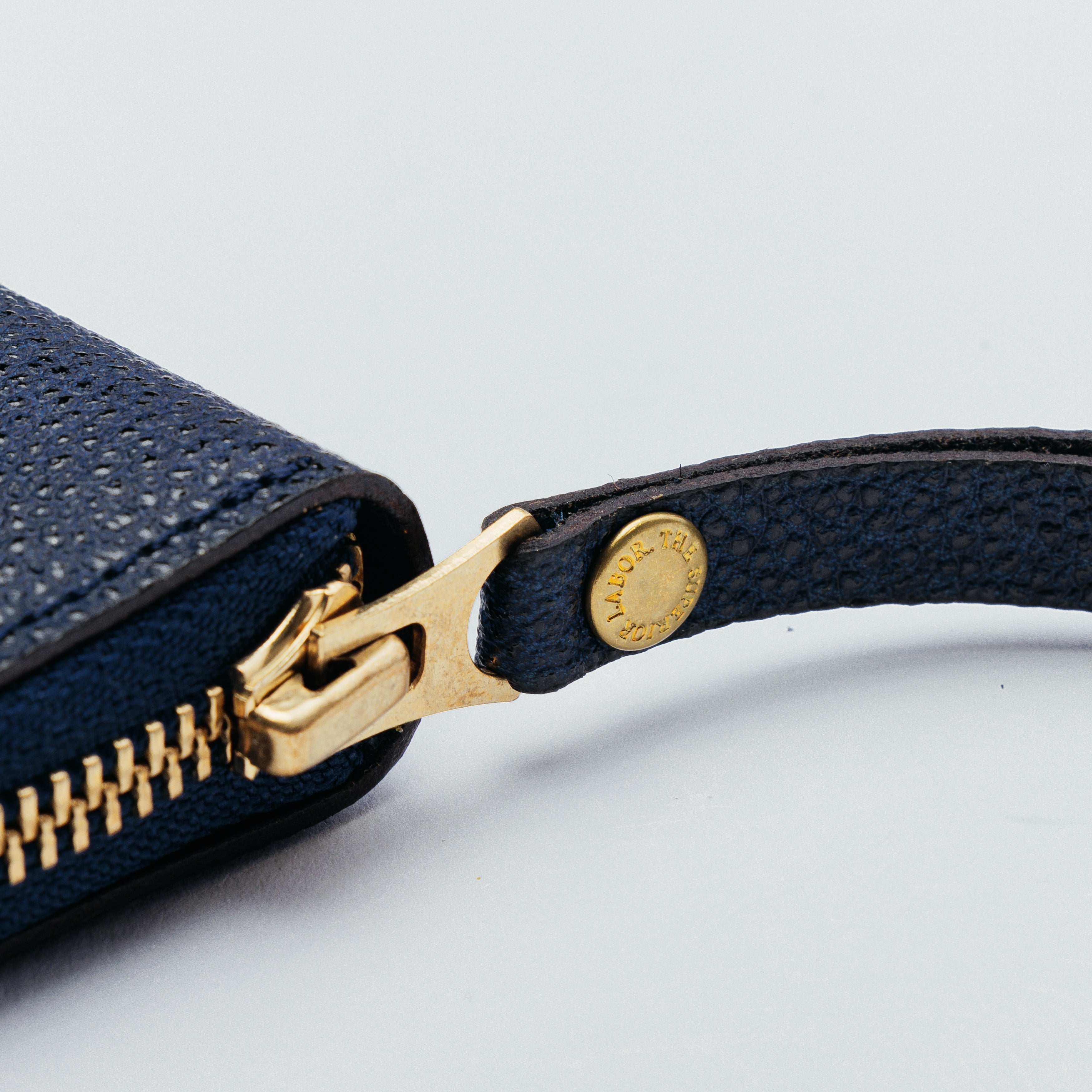 The leather is hand-dyed with natural indigo and lacquered to produce a deep gloss and shade.