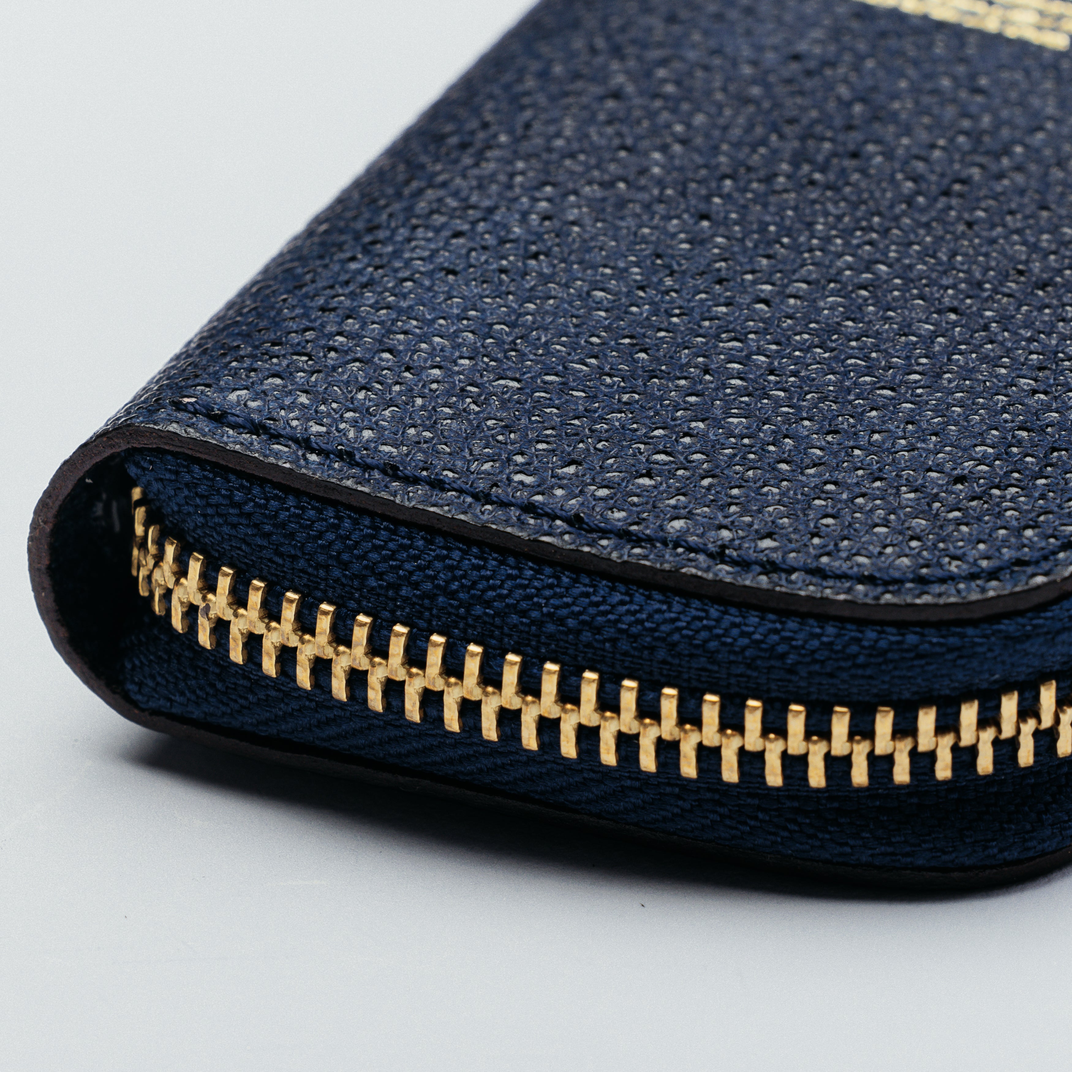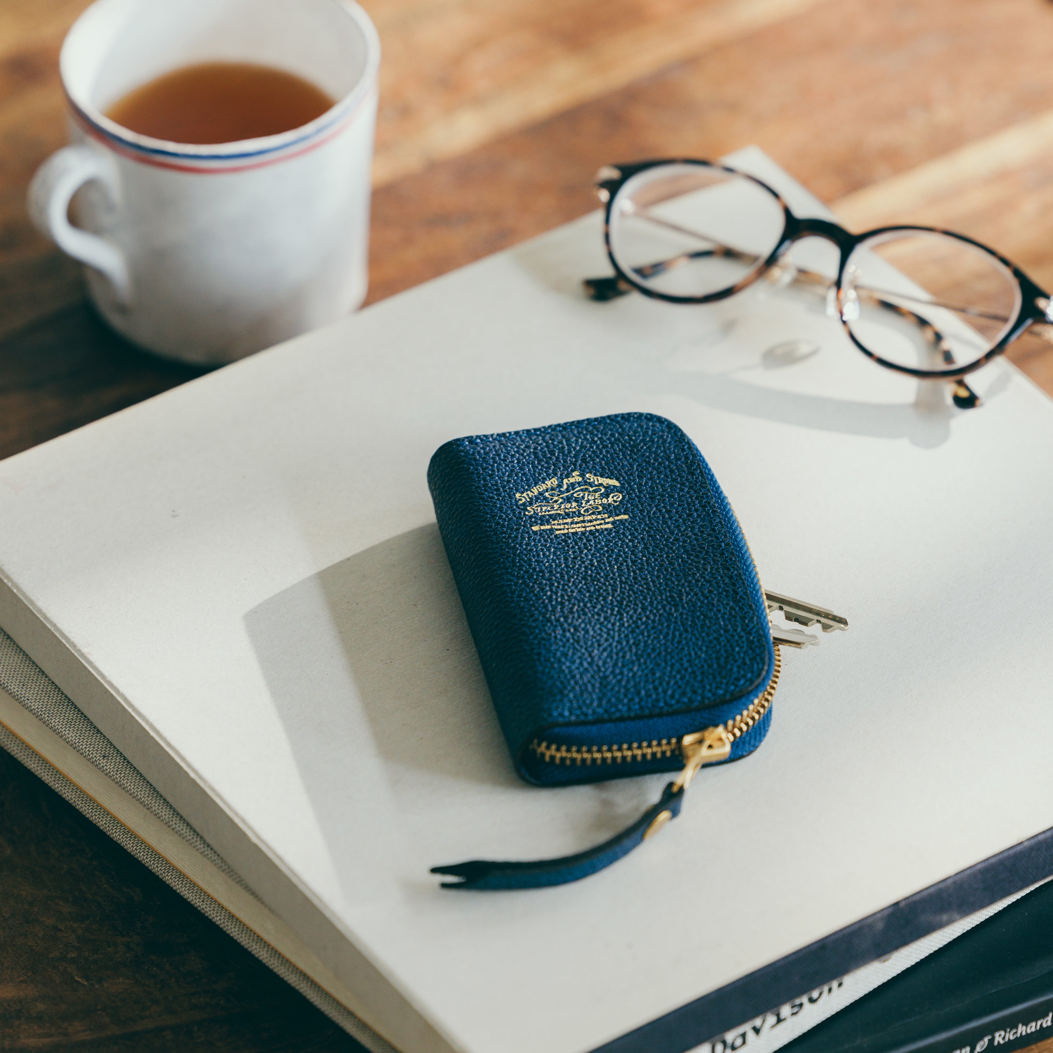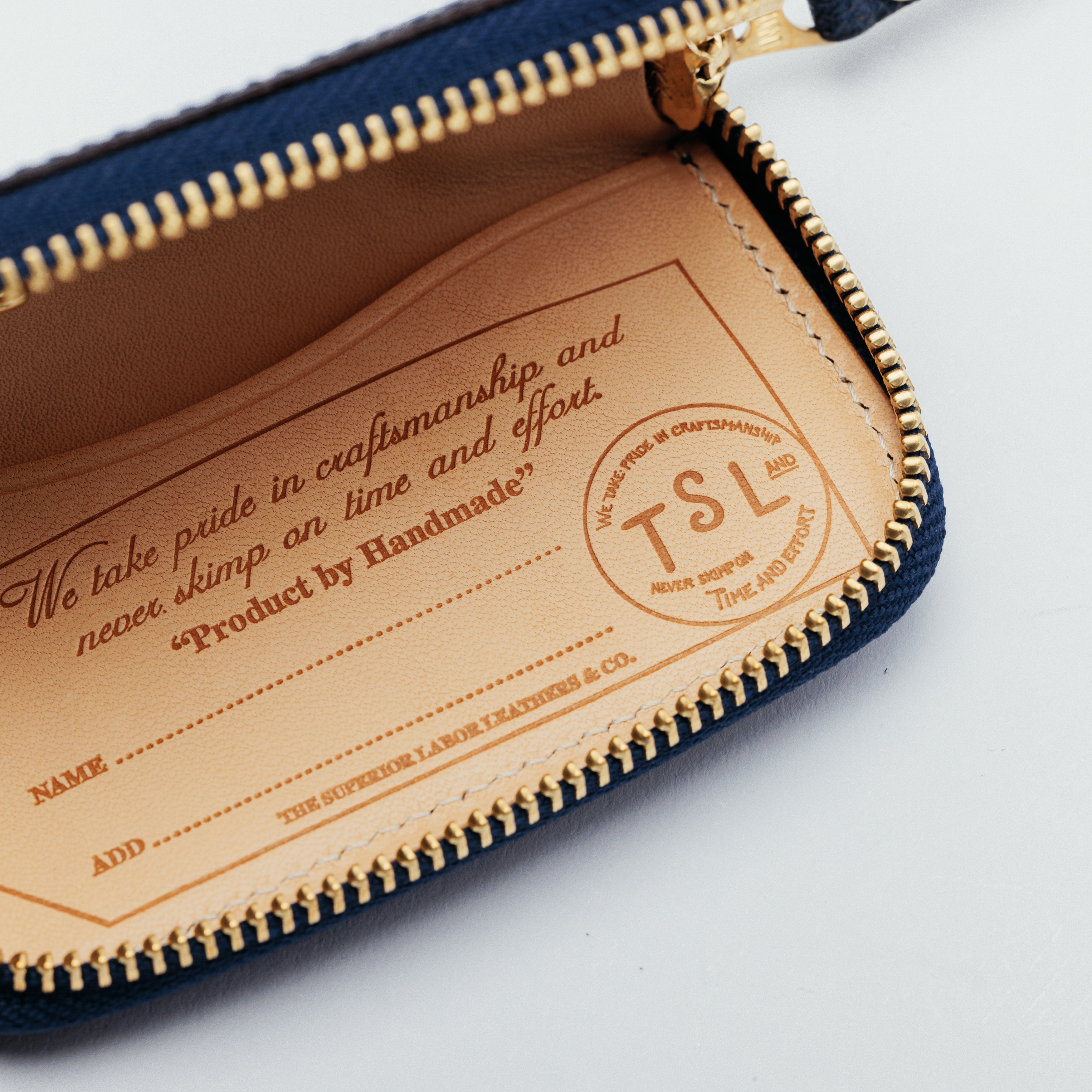 The leather is hand-dyed with natural indigo and lacquered to produce a deep gloss and shade.