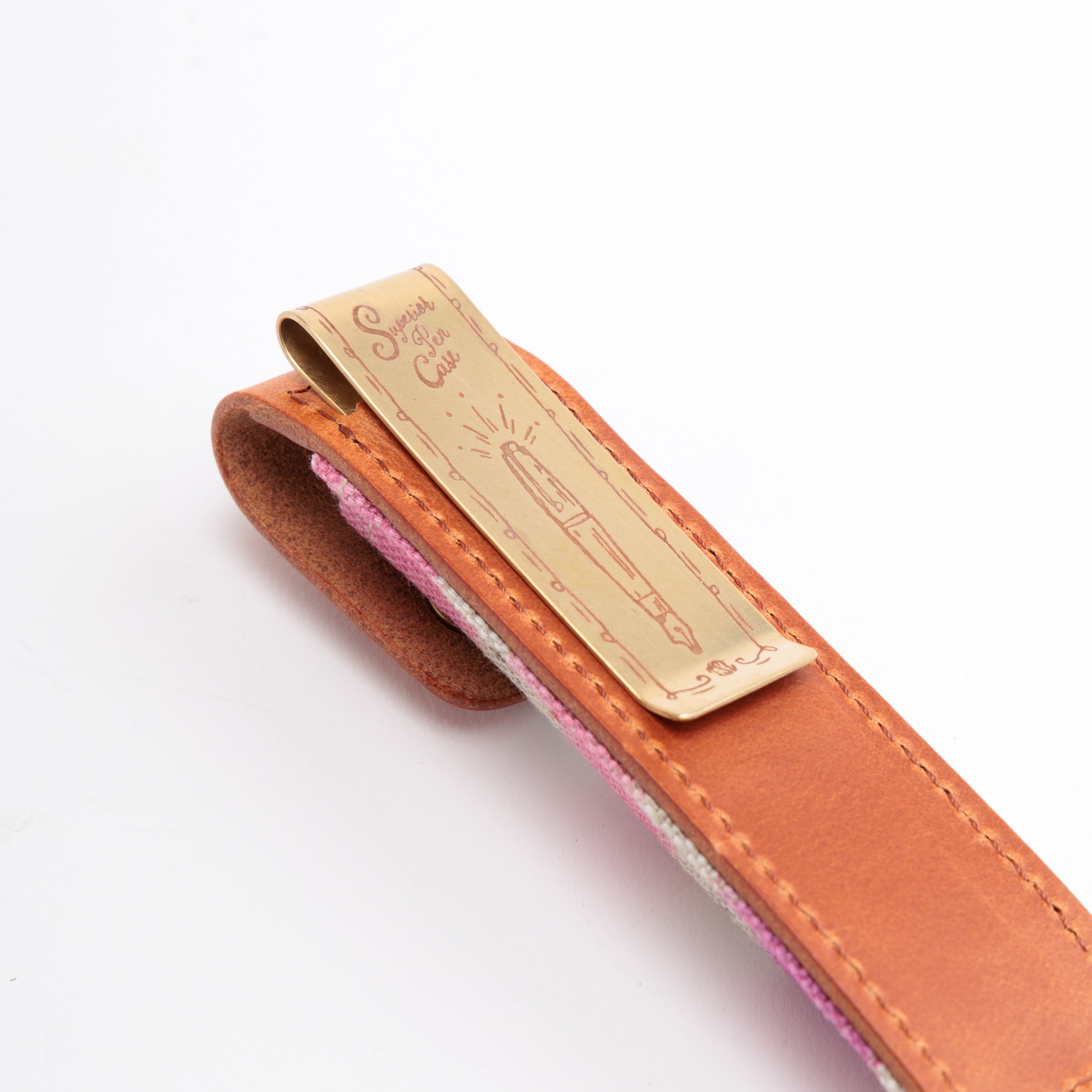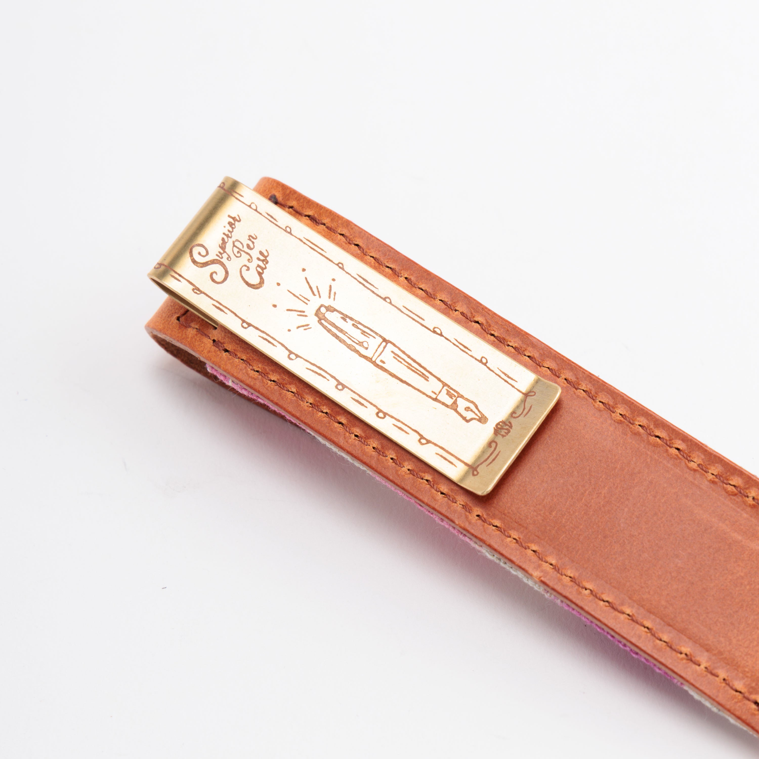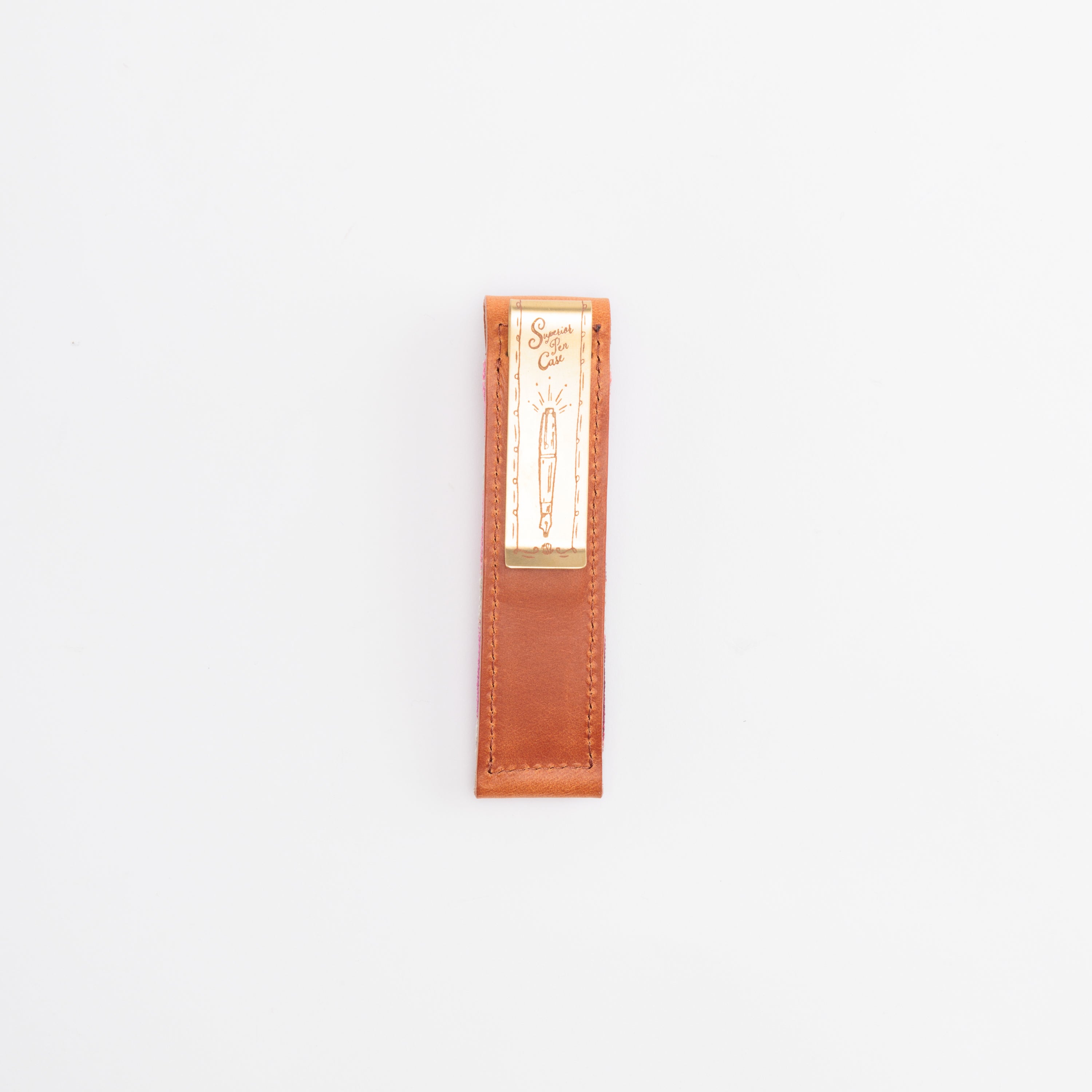 太さ1cm、長さ10cmほどのペンが1本入ります。裏側に真鍮製のクリップが付いているので