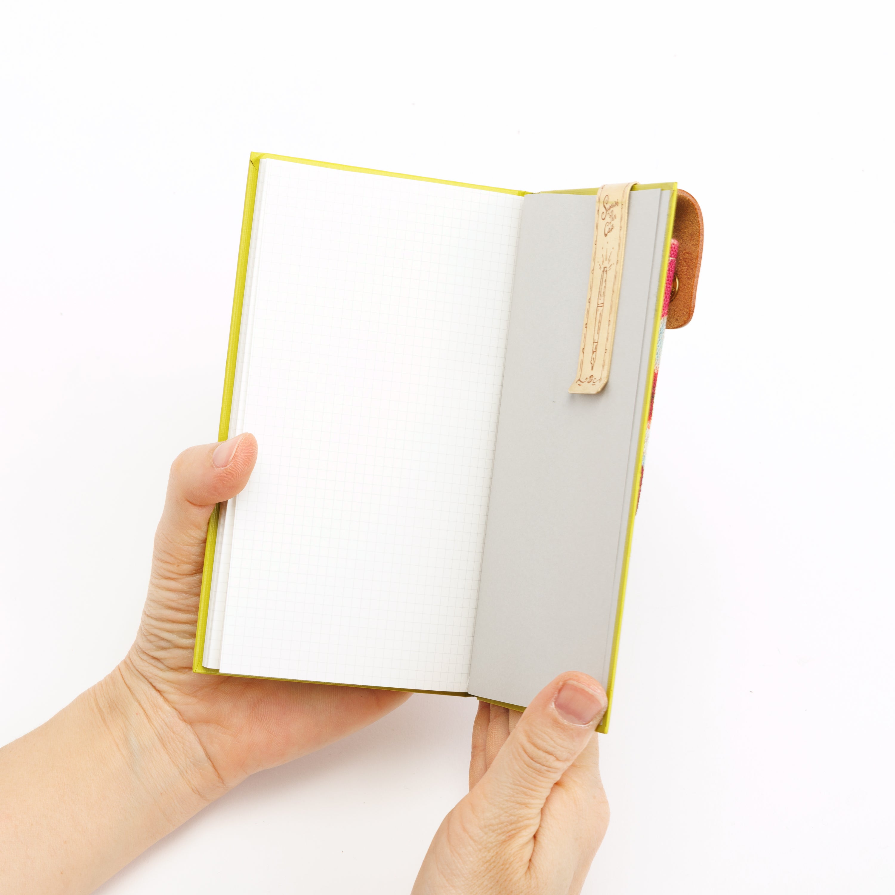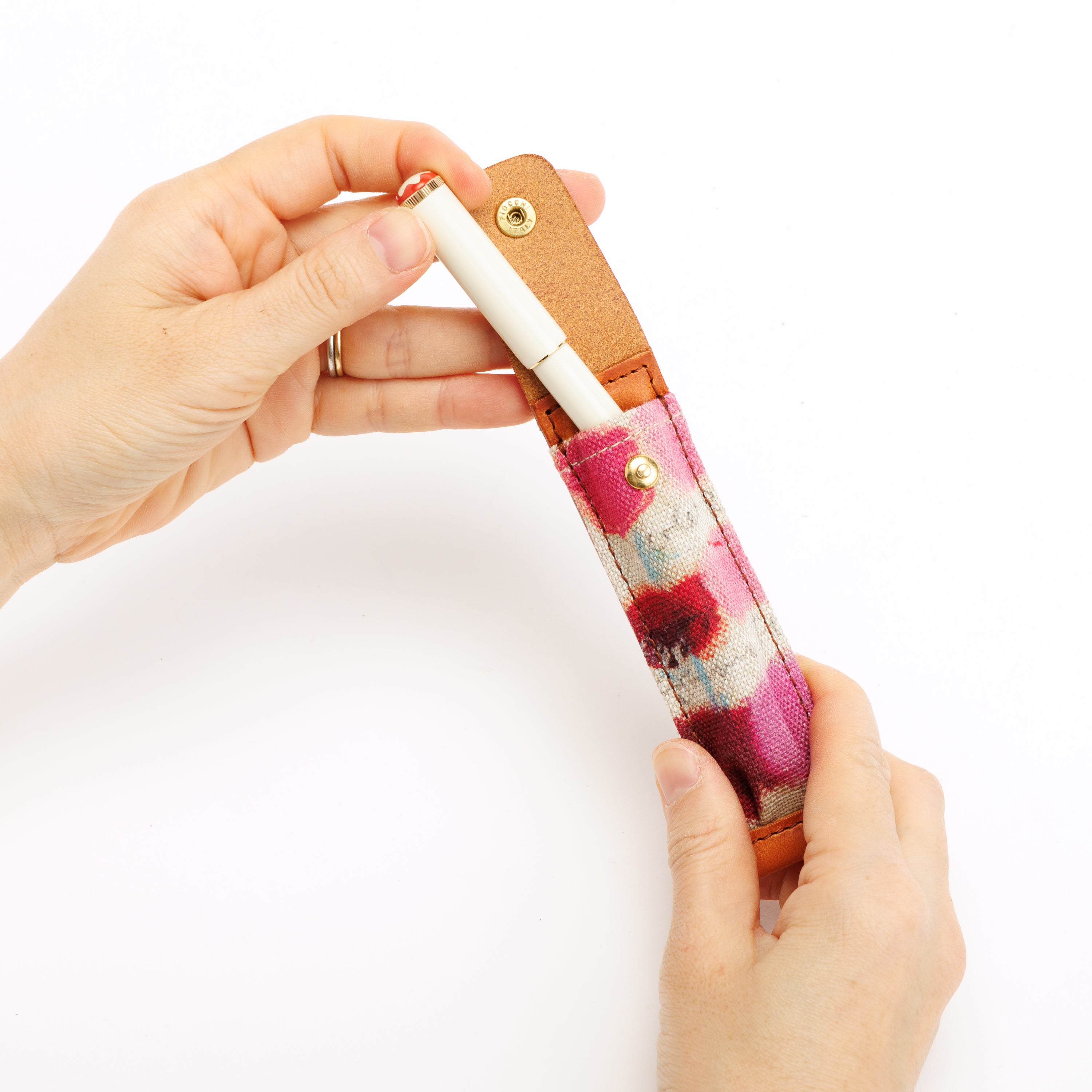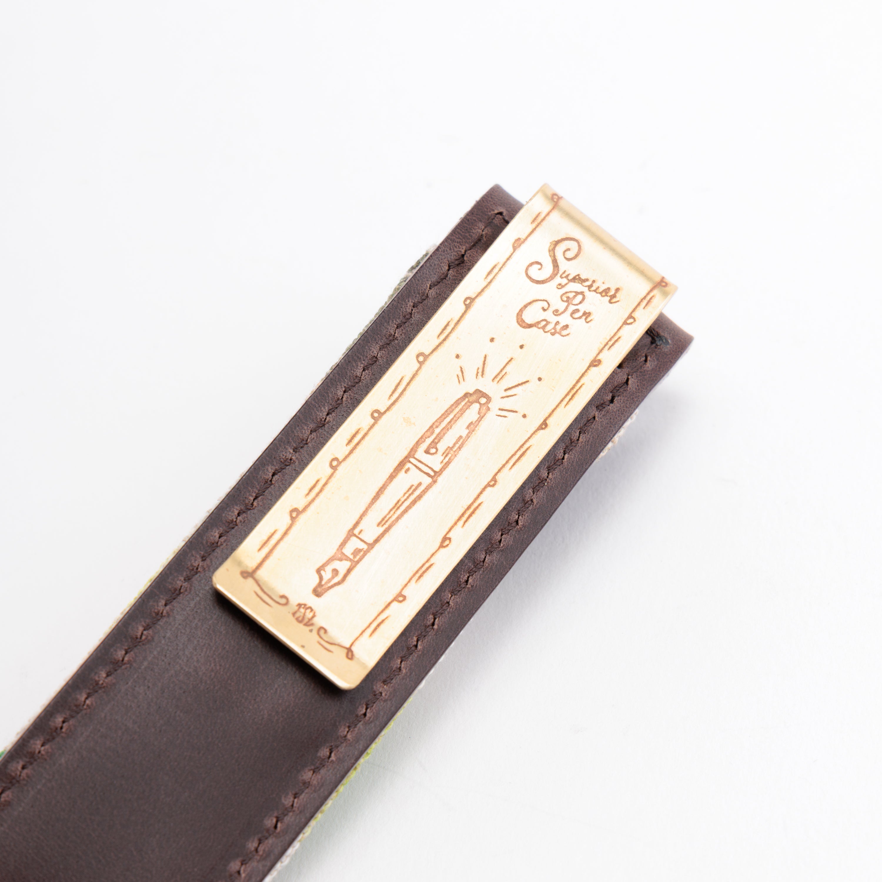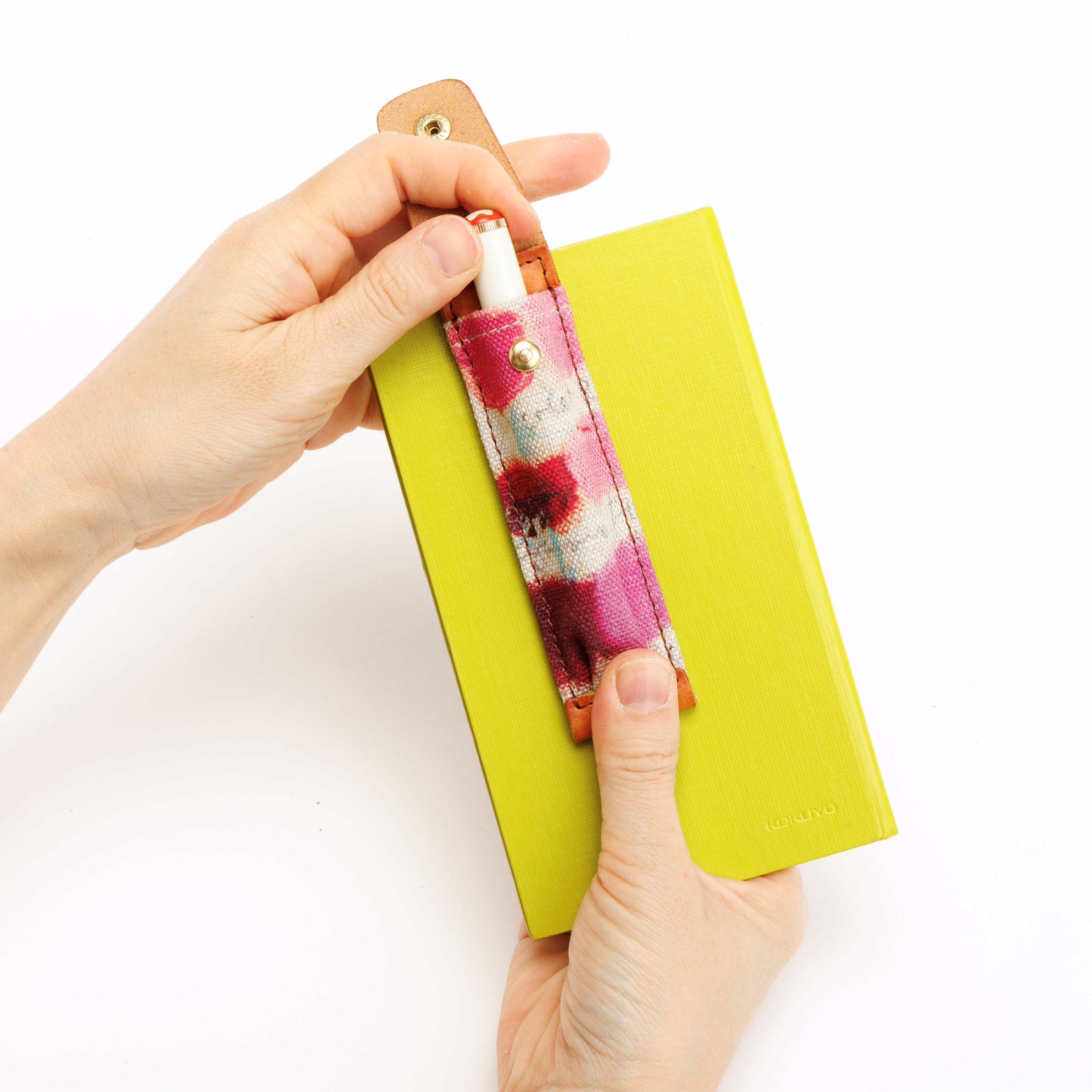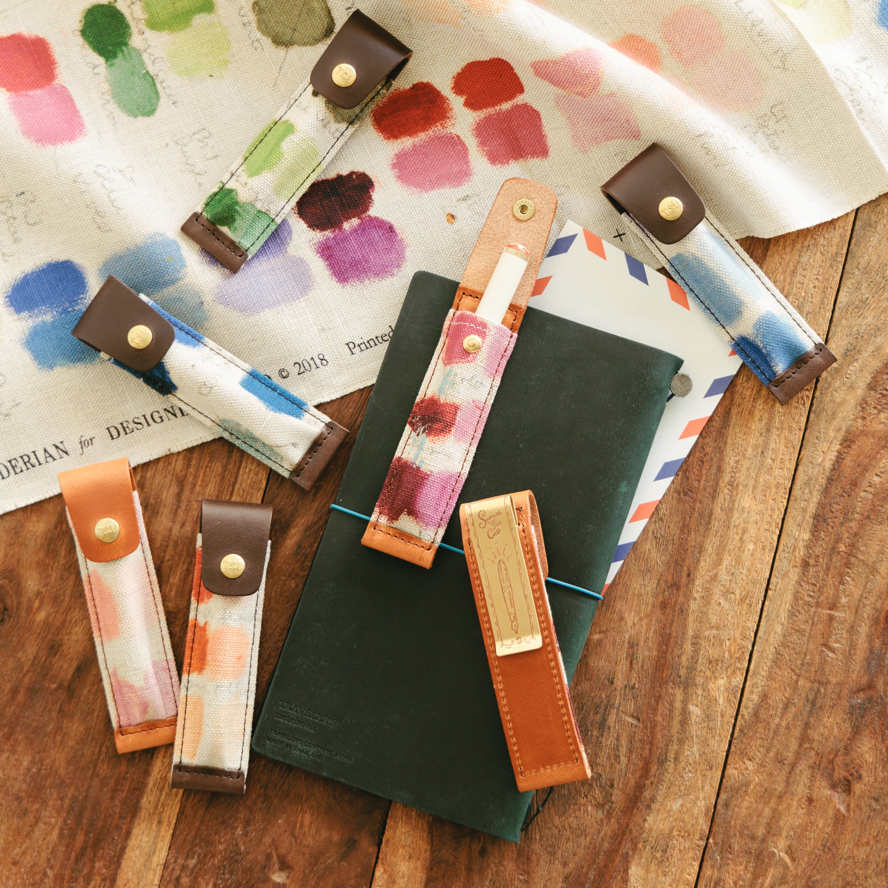 ボディにはJOHN DERIANデザインの生地を使用、裏のクリップには万年筆のイラストをエッチングで入れました。
