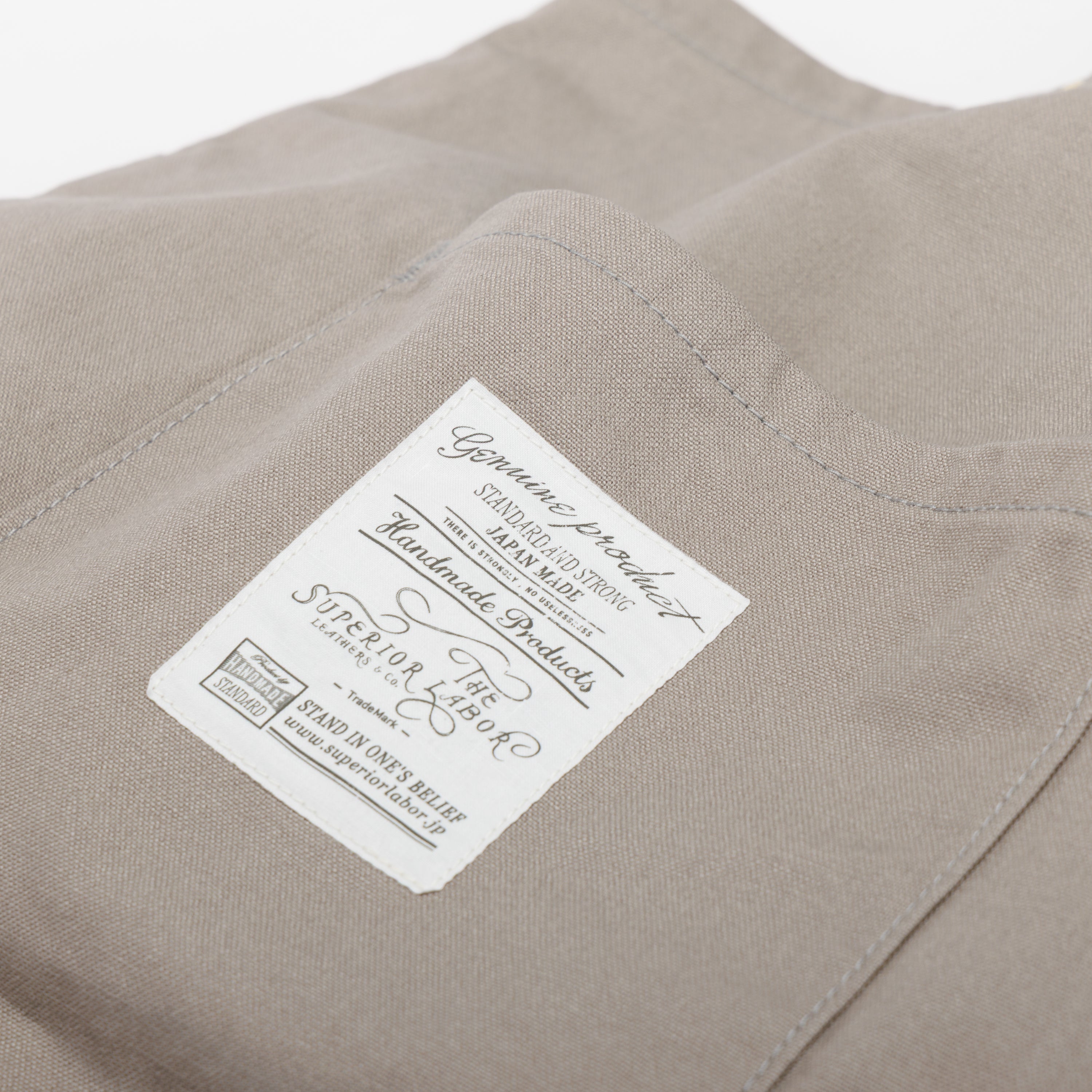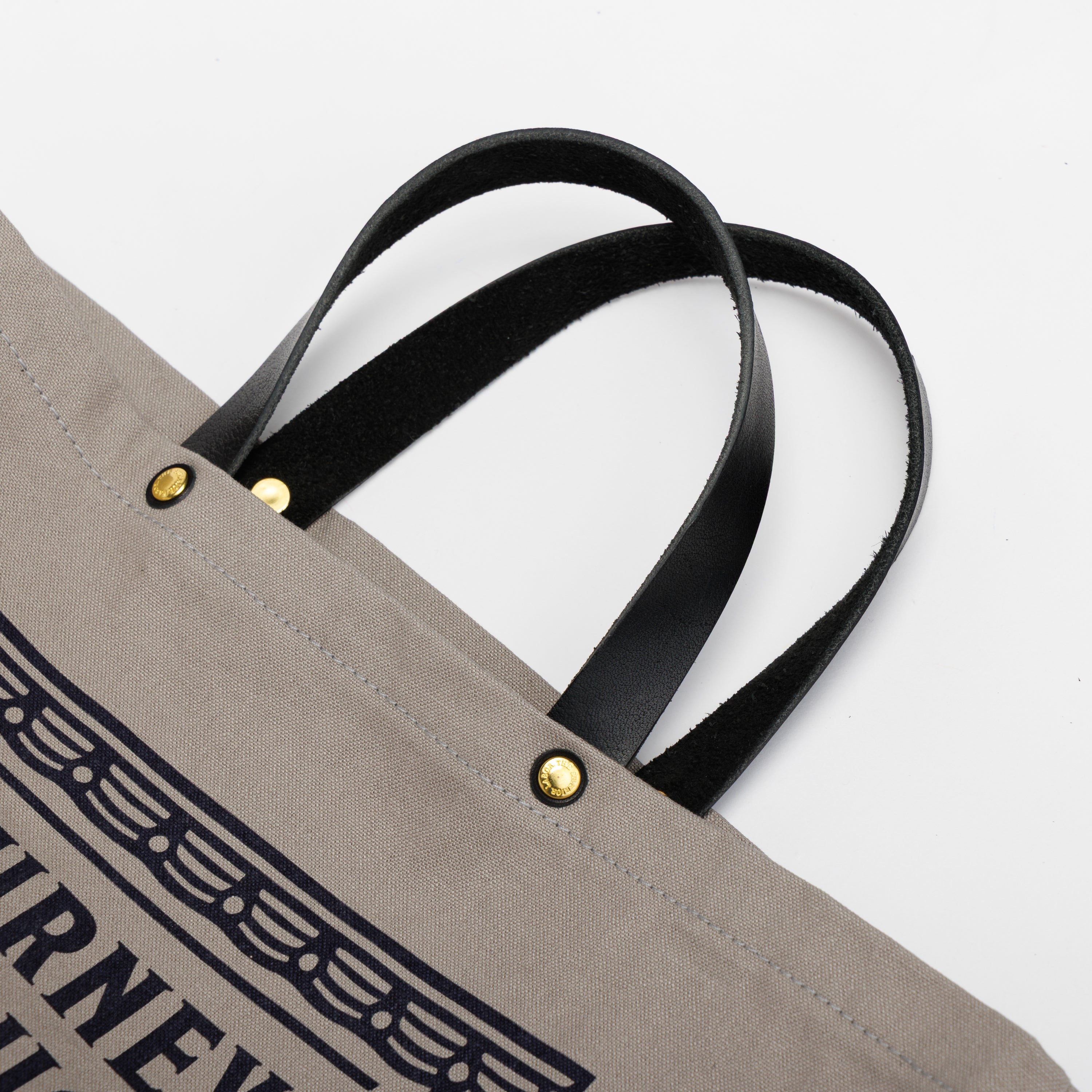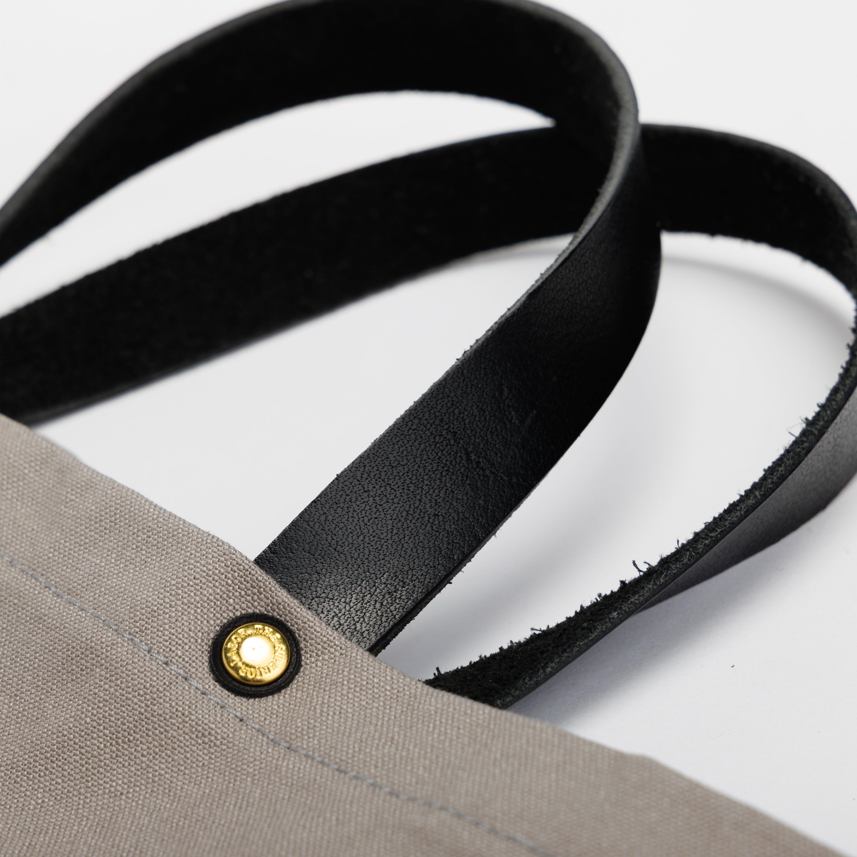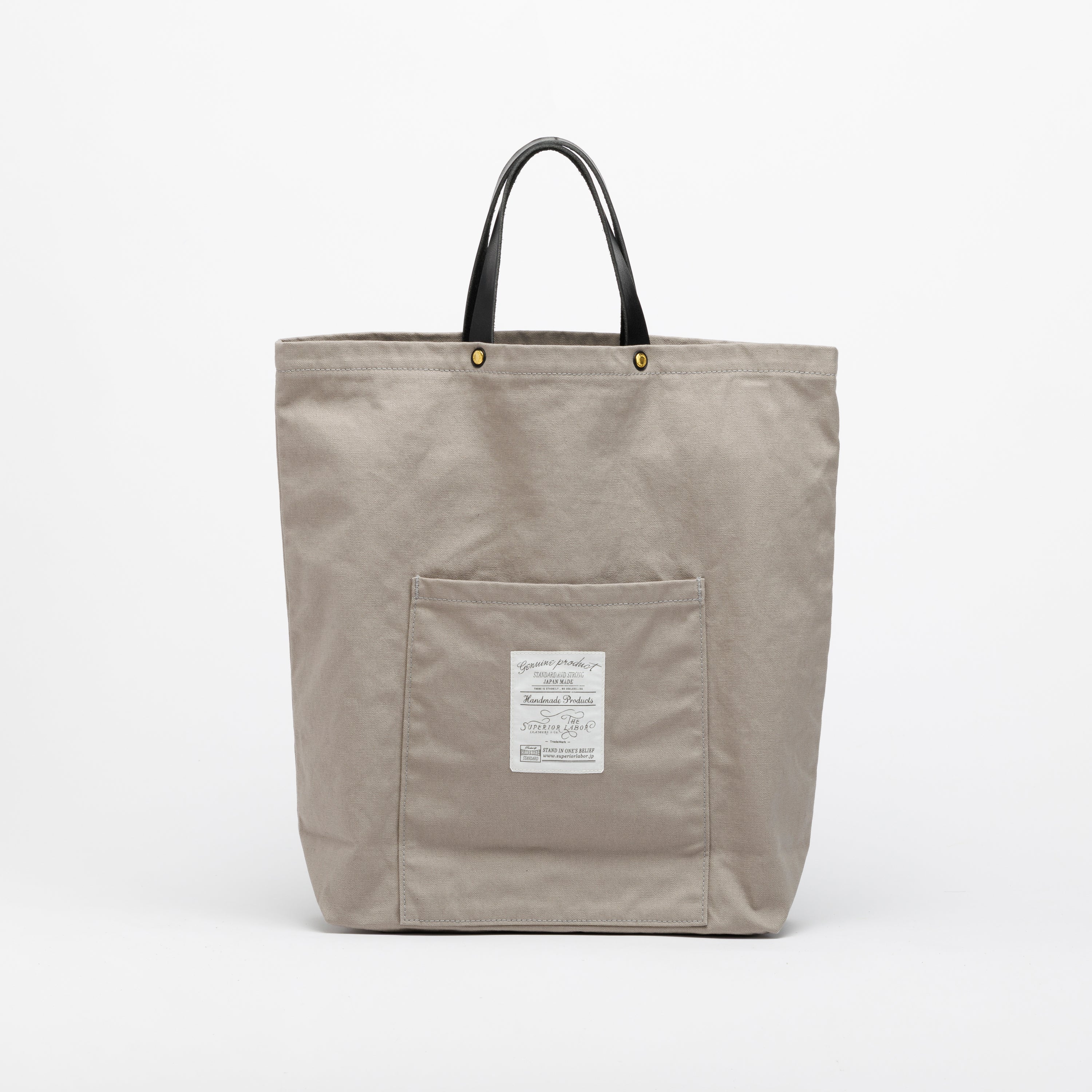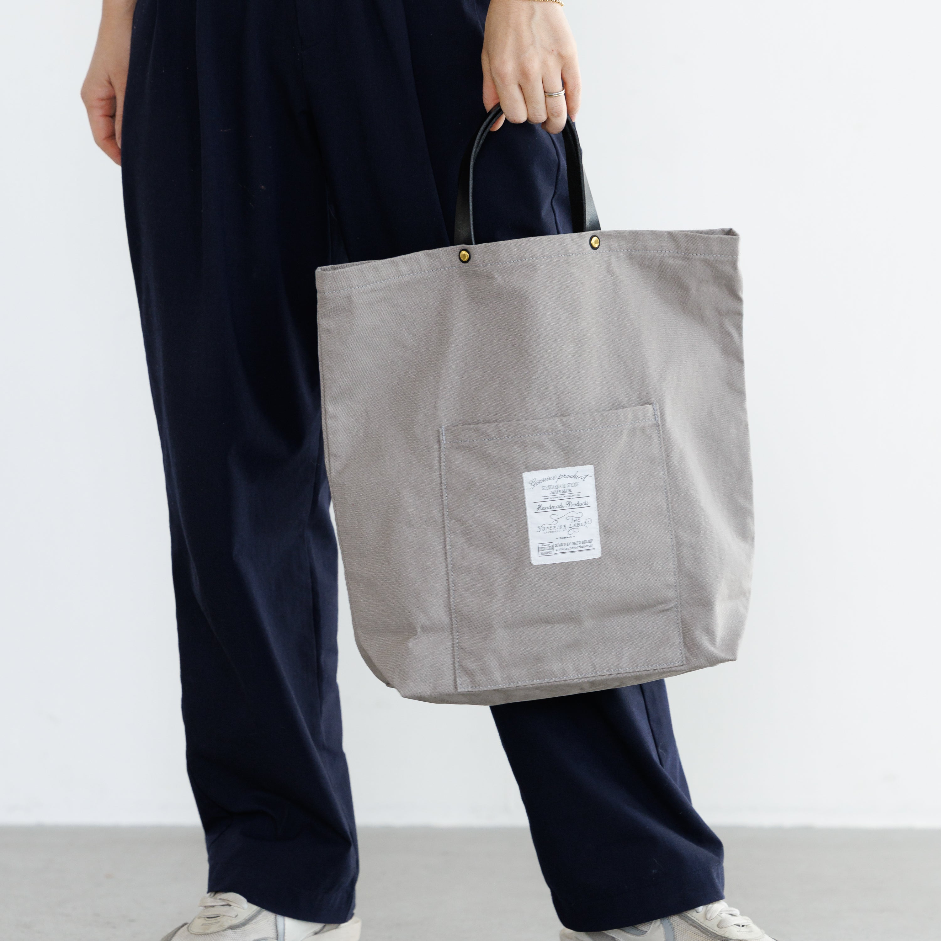 薄手で軽やかなキャンバス生地に、手に下げた時の収まりが良い 短めのレザーハンドルを組み合わせ、外側には大きなポケットを付けています。