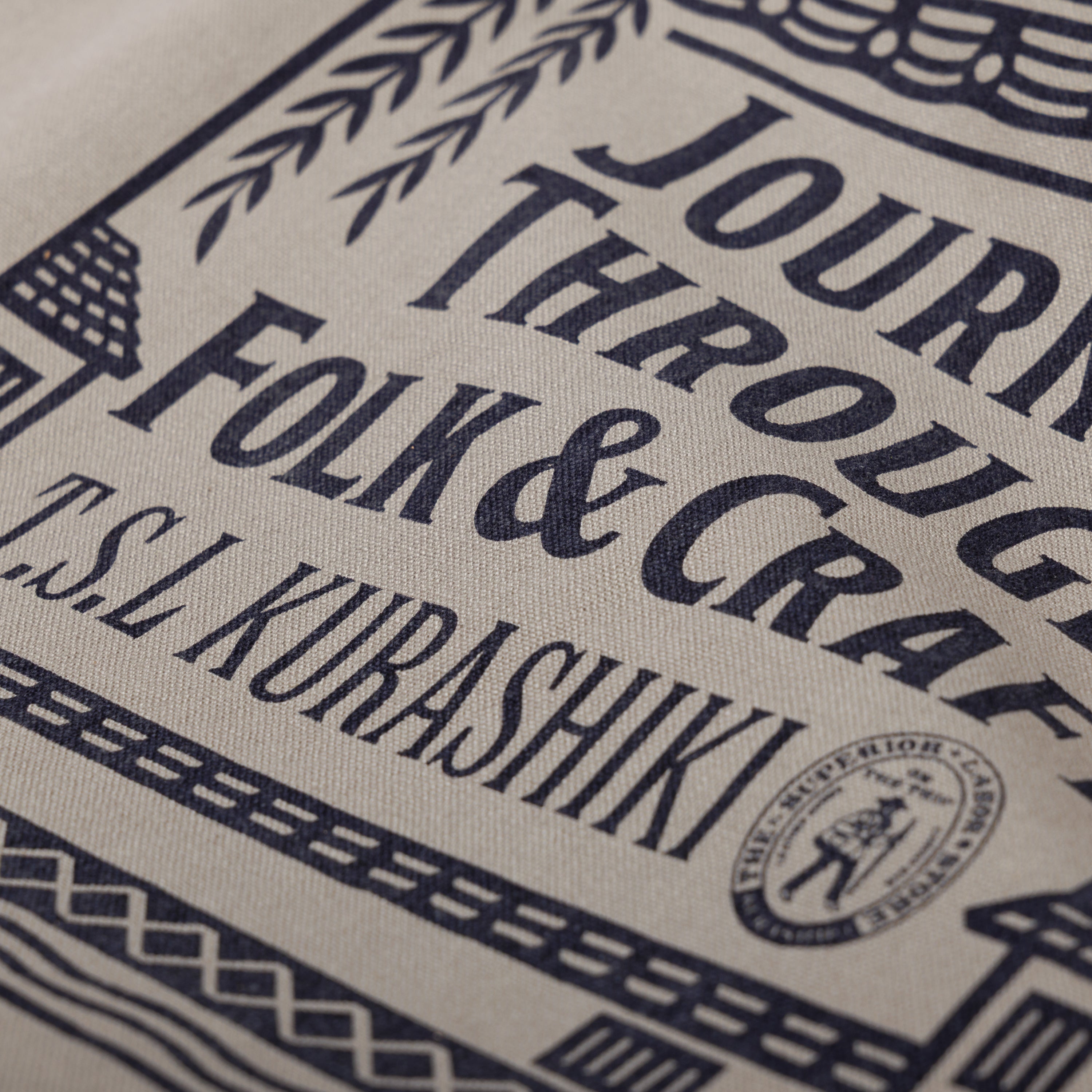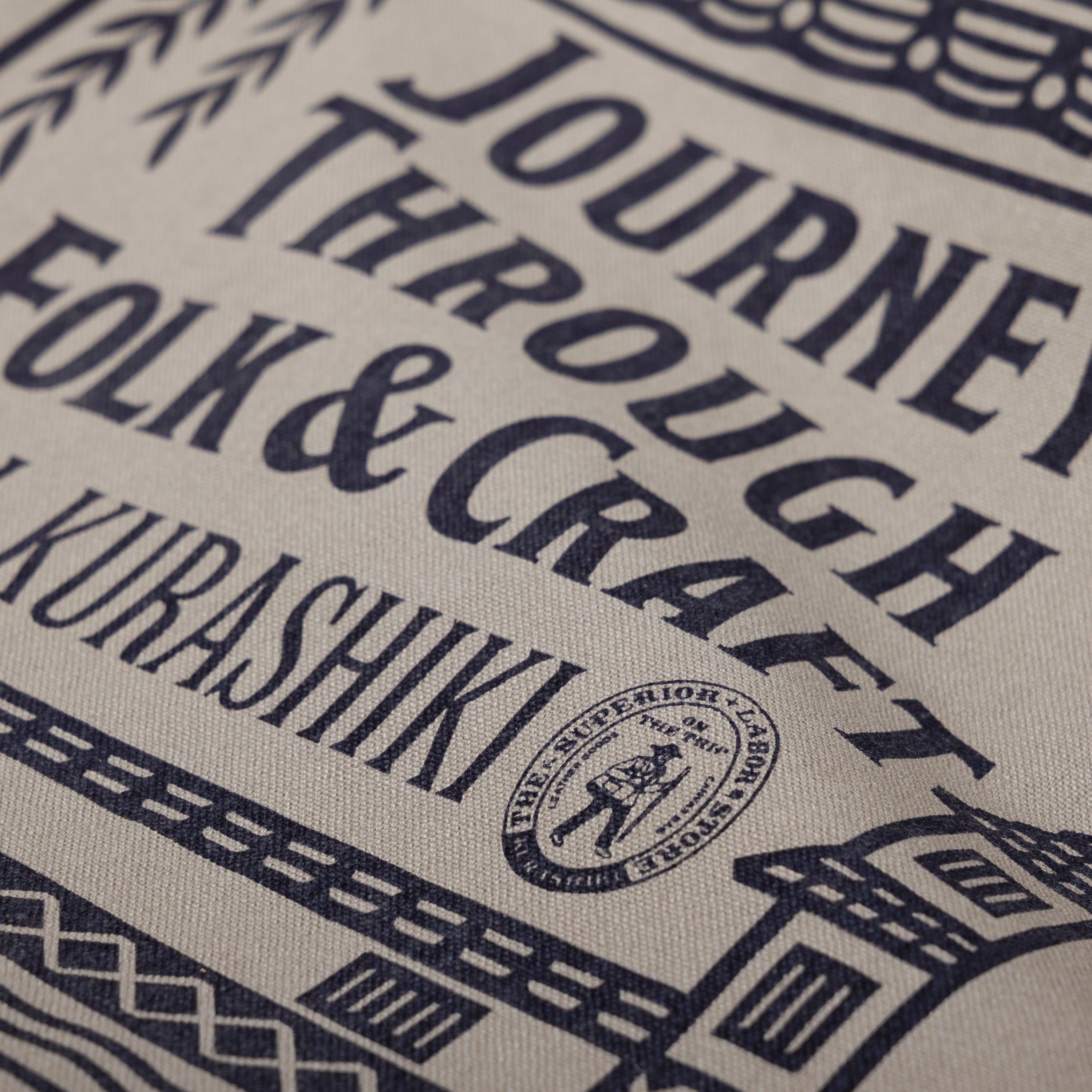 土地の風景や文化、ものづくりとの出会いを想う ” Journey Through Folk & Craft " という言葉と共に ショップのイメージカラー、ネイビーでプリントしました。