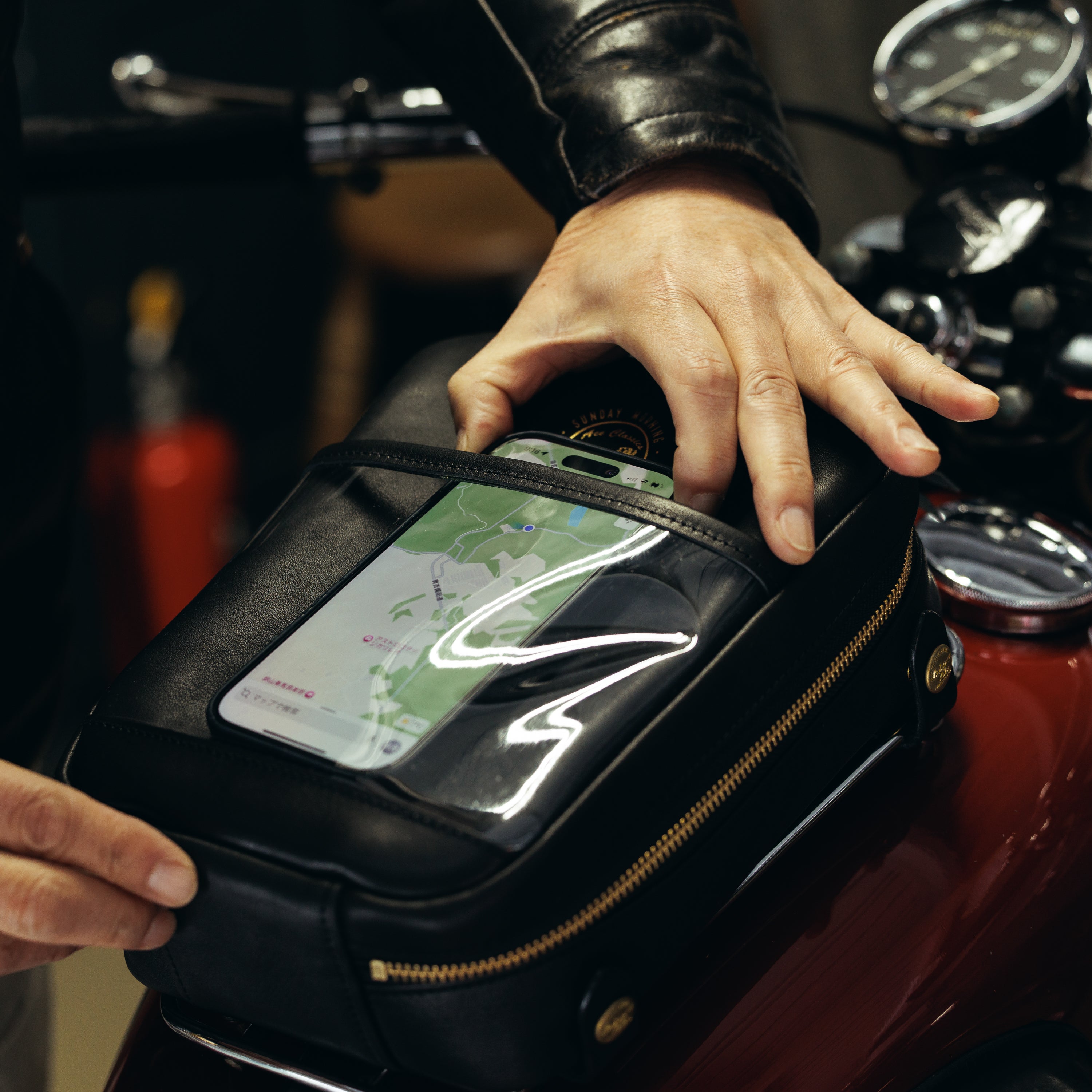 前面には地図やスマートフォンが確認しやすい、PVC製の透明ポケットを備えています。