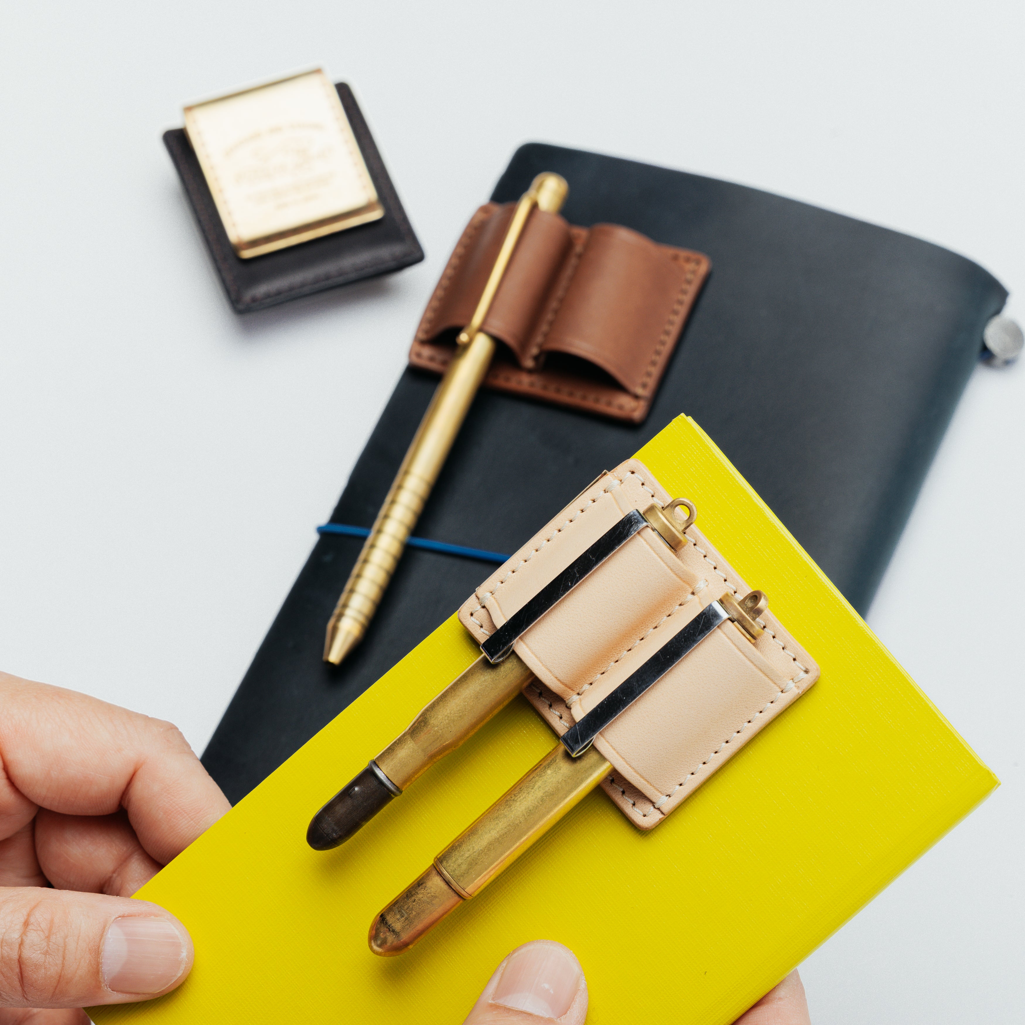 裏面のクリップでノートや手帳の表紙にセットできるペンホルダーです。
