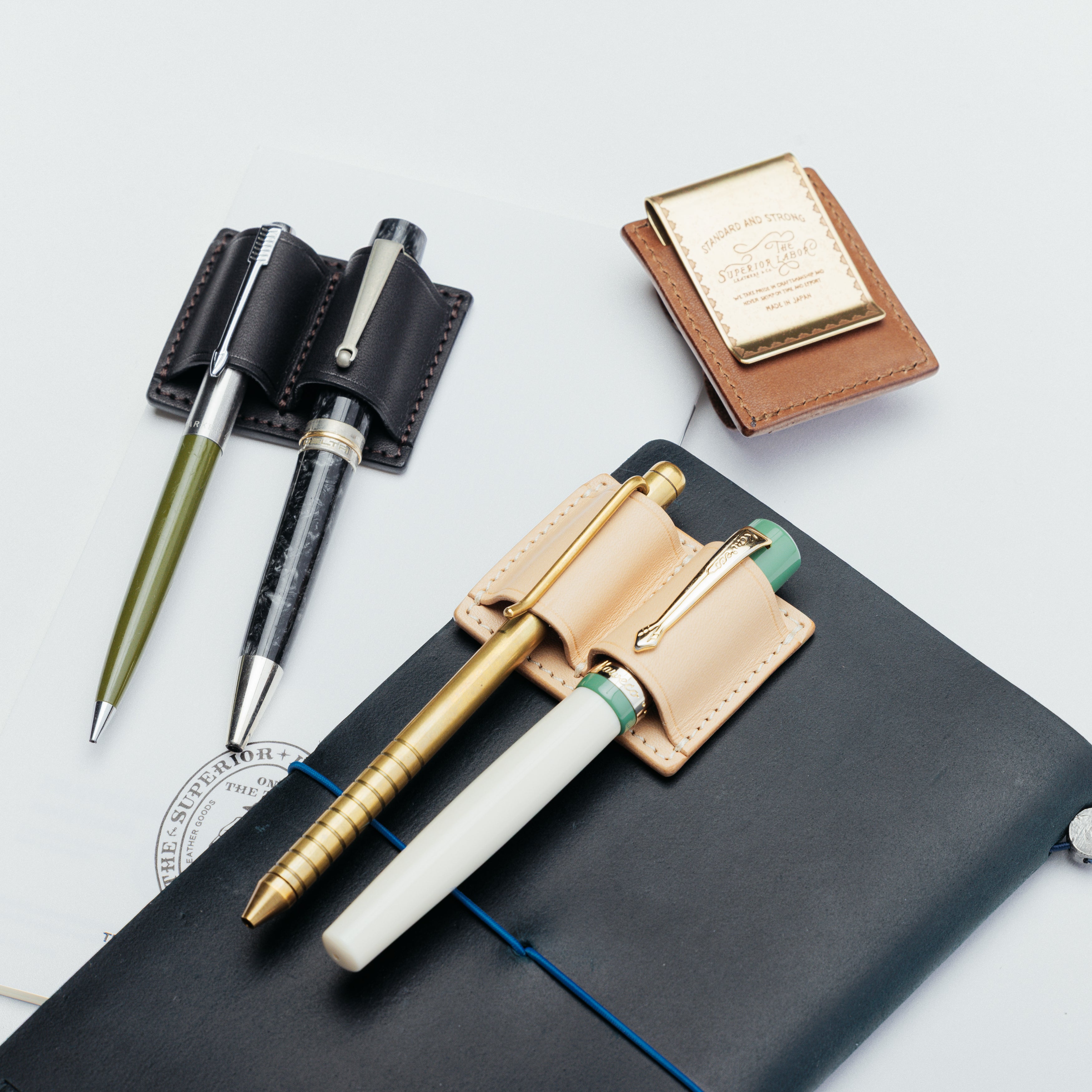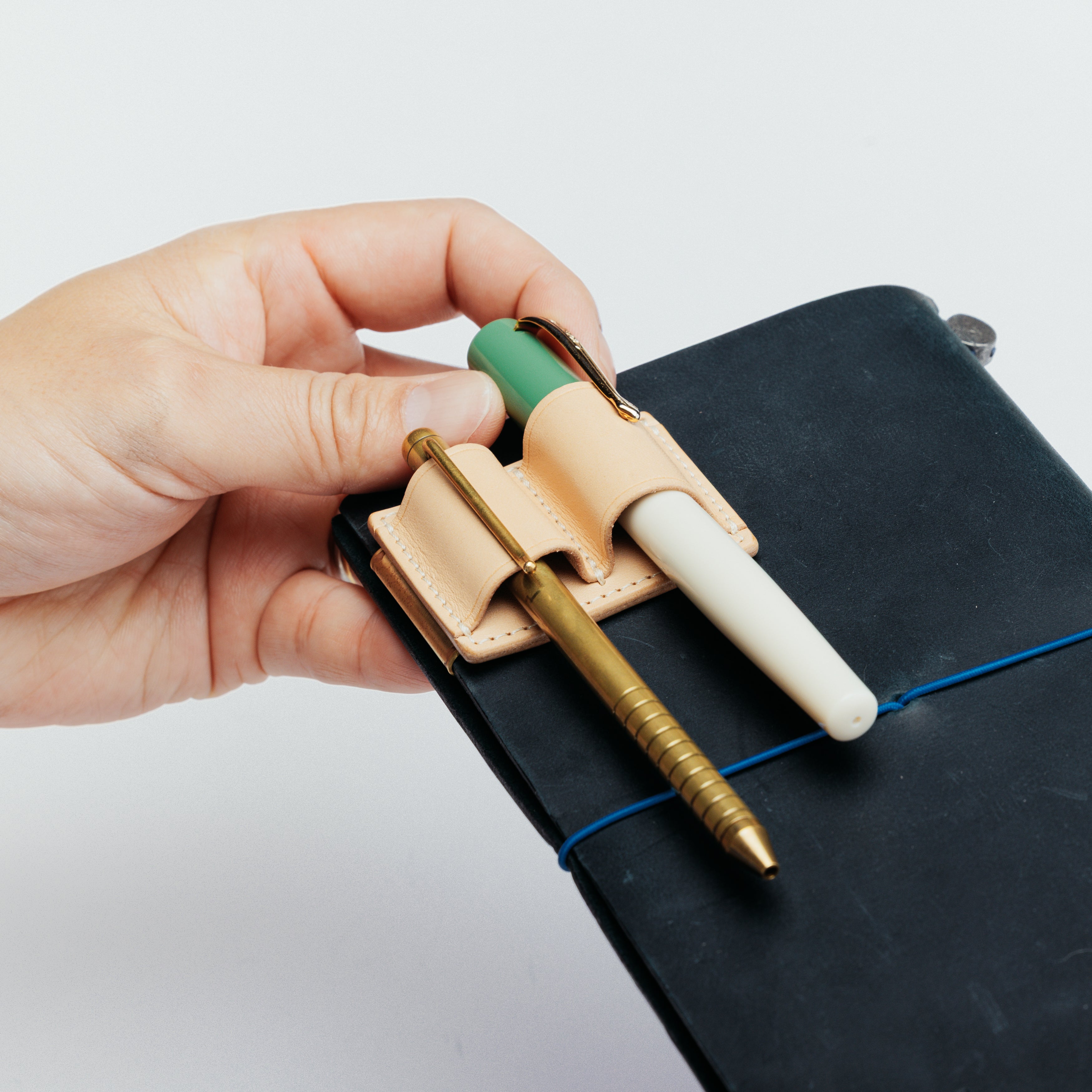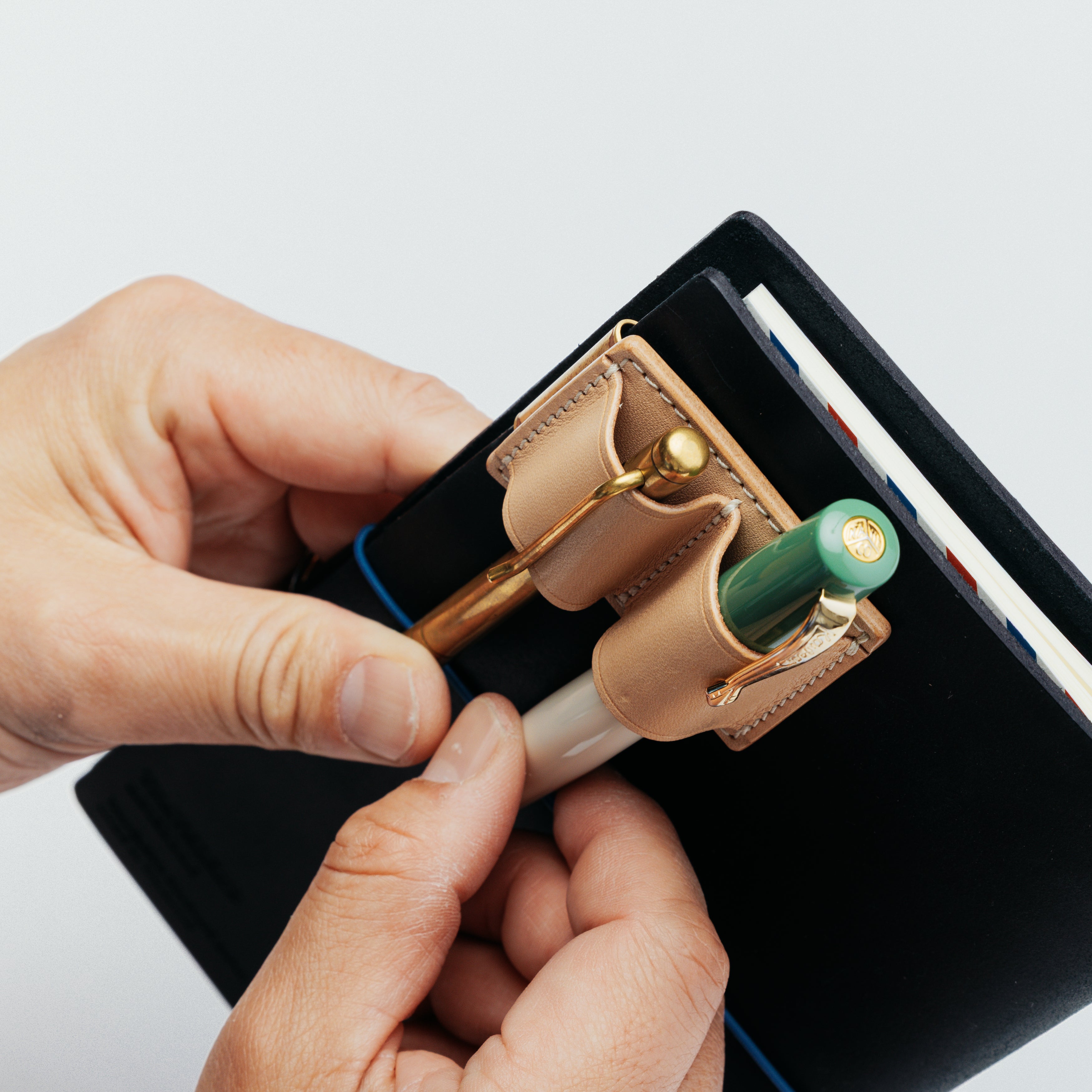 裏面のクリップでノートや手帳の表紙にセットできるペンホルダーです。