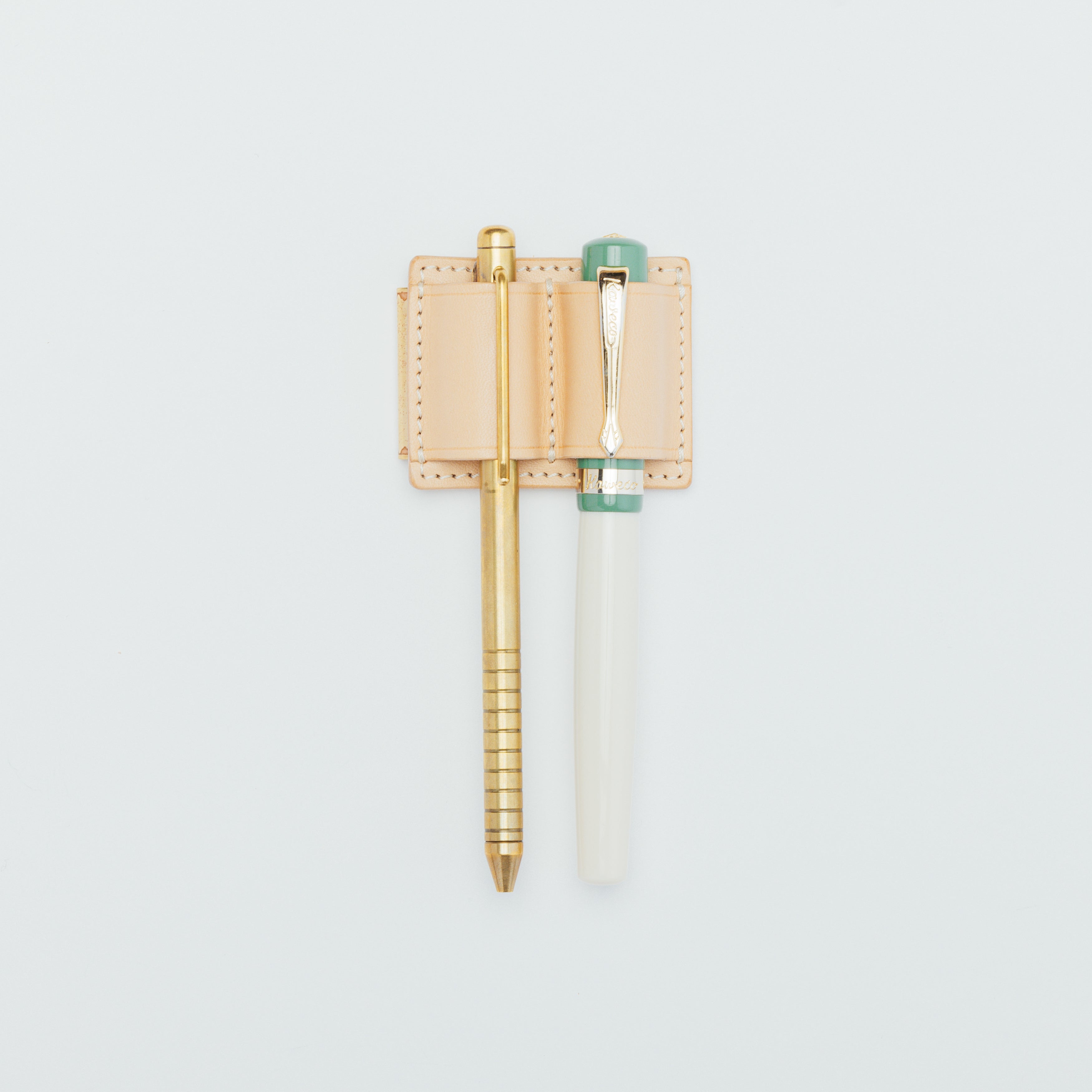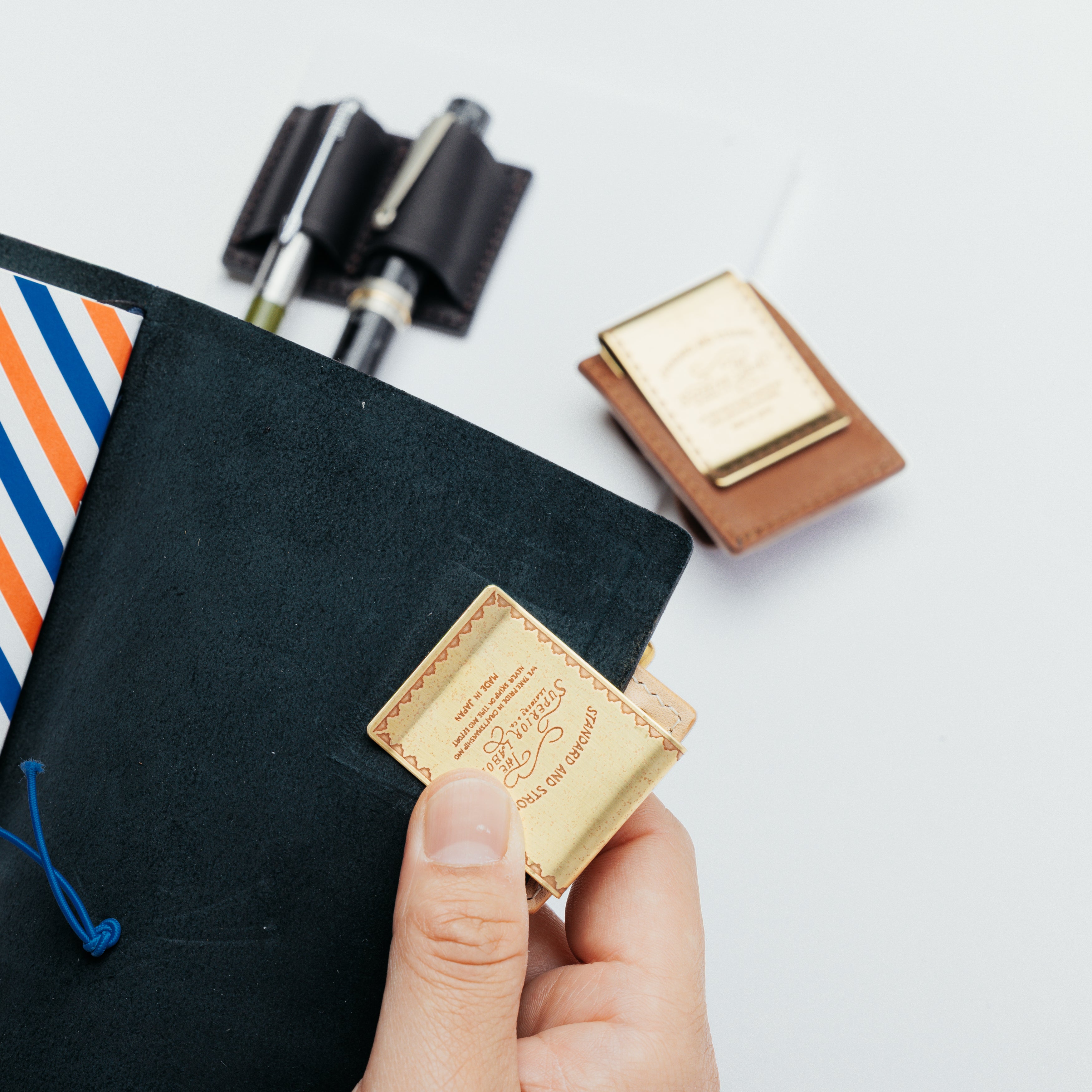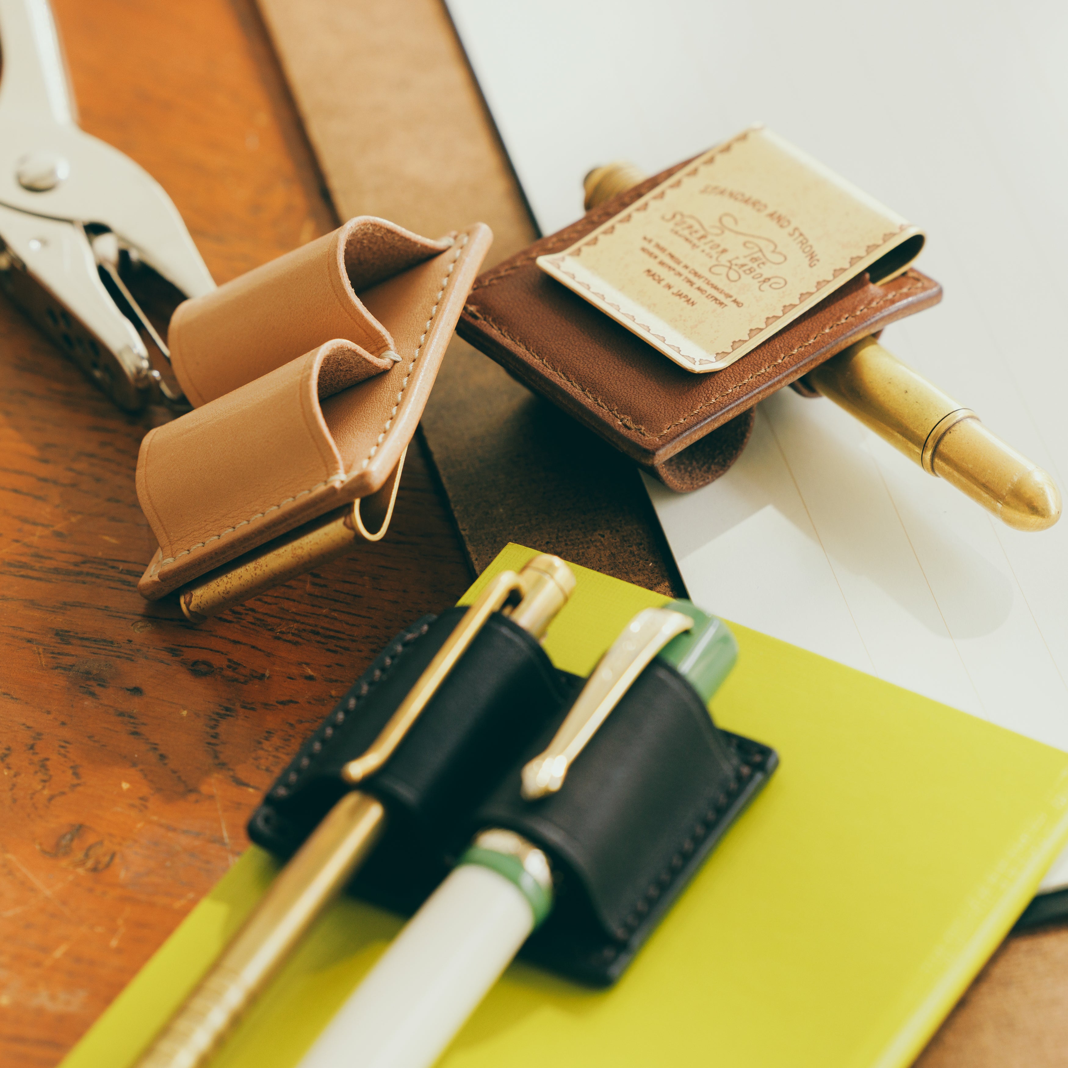 裏面のクリップでノートや手帳の表紙にセットできるペンホルダーです。