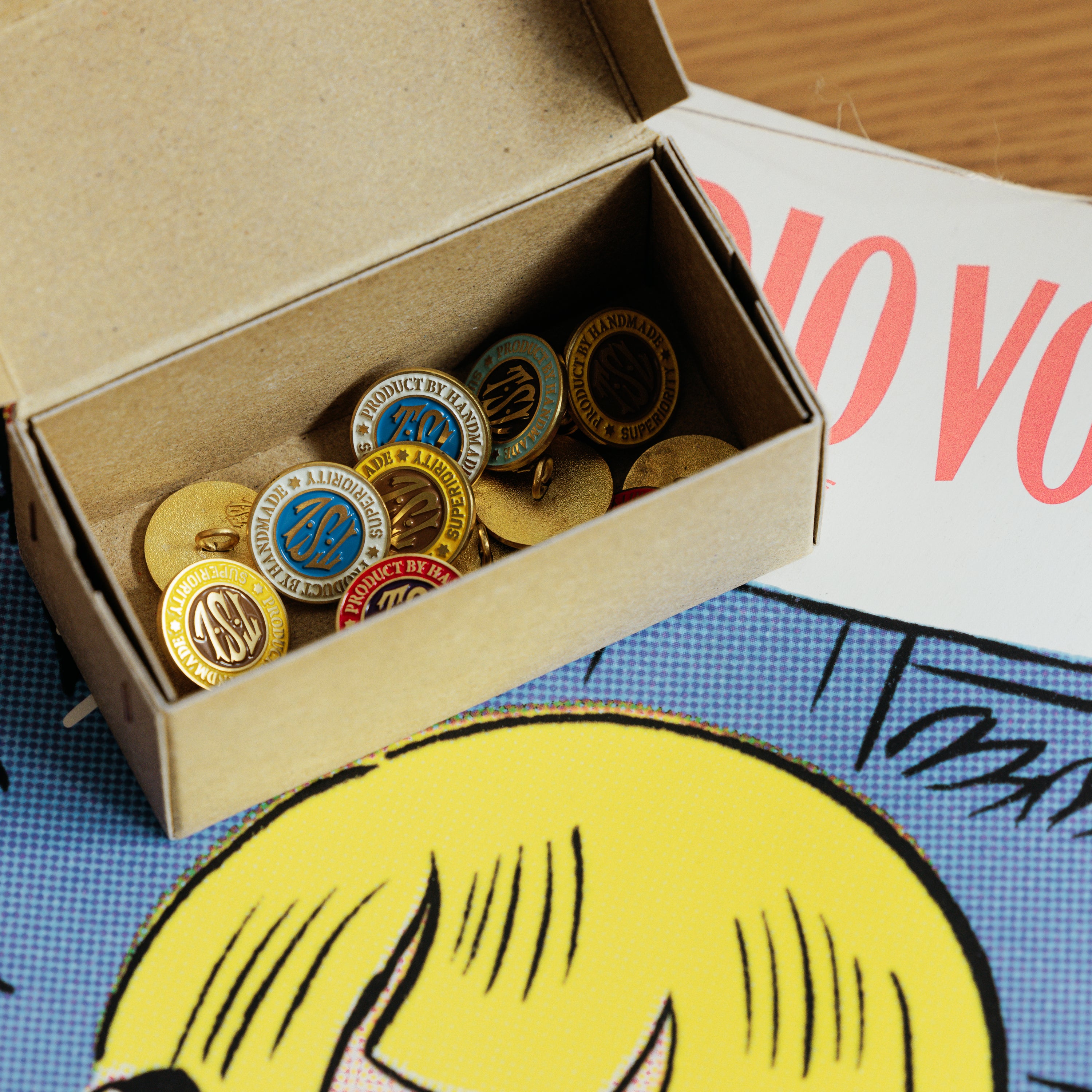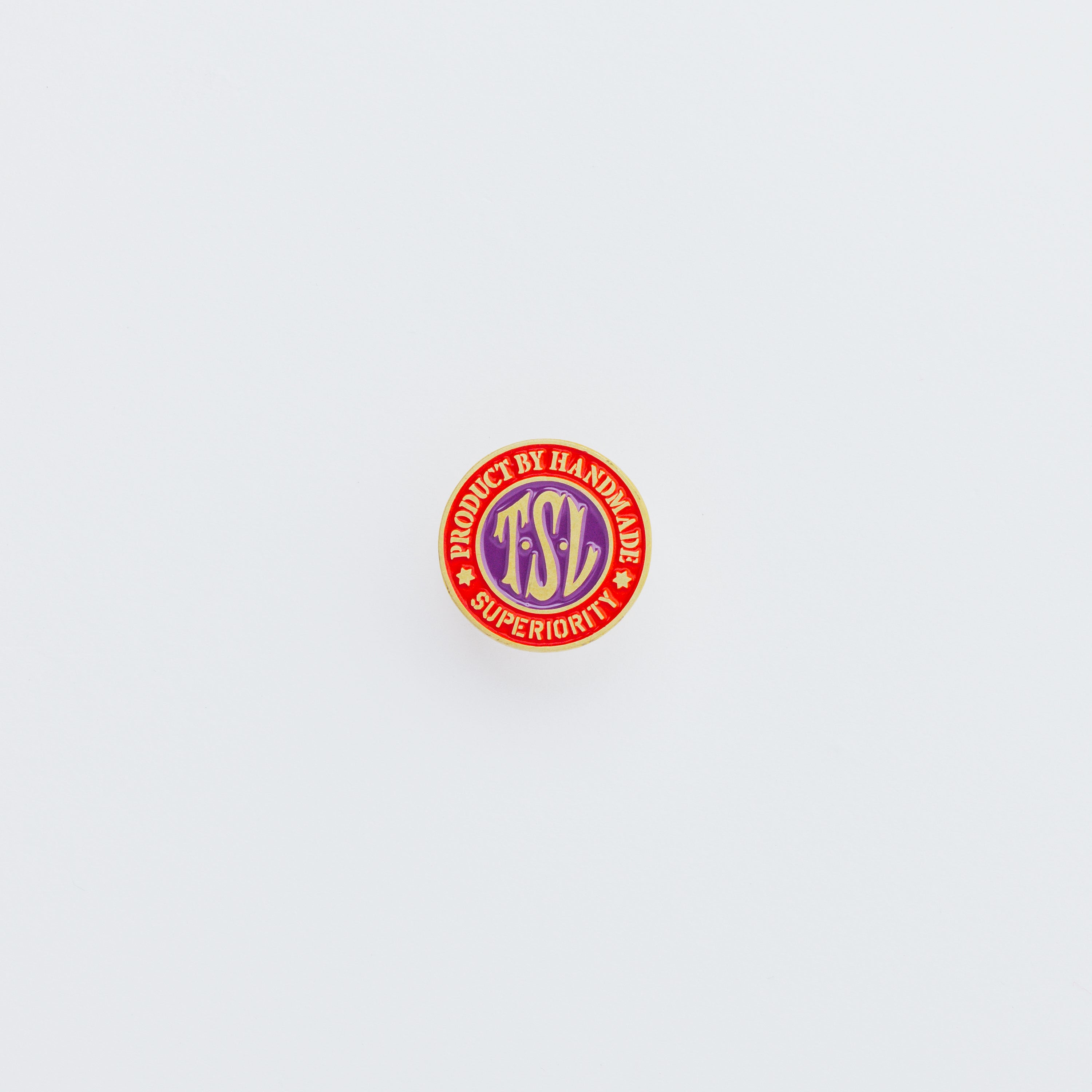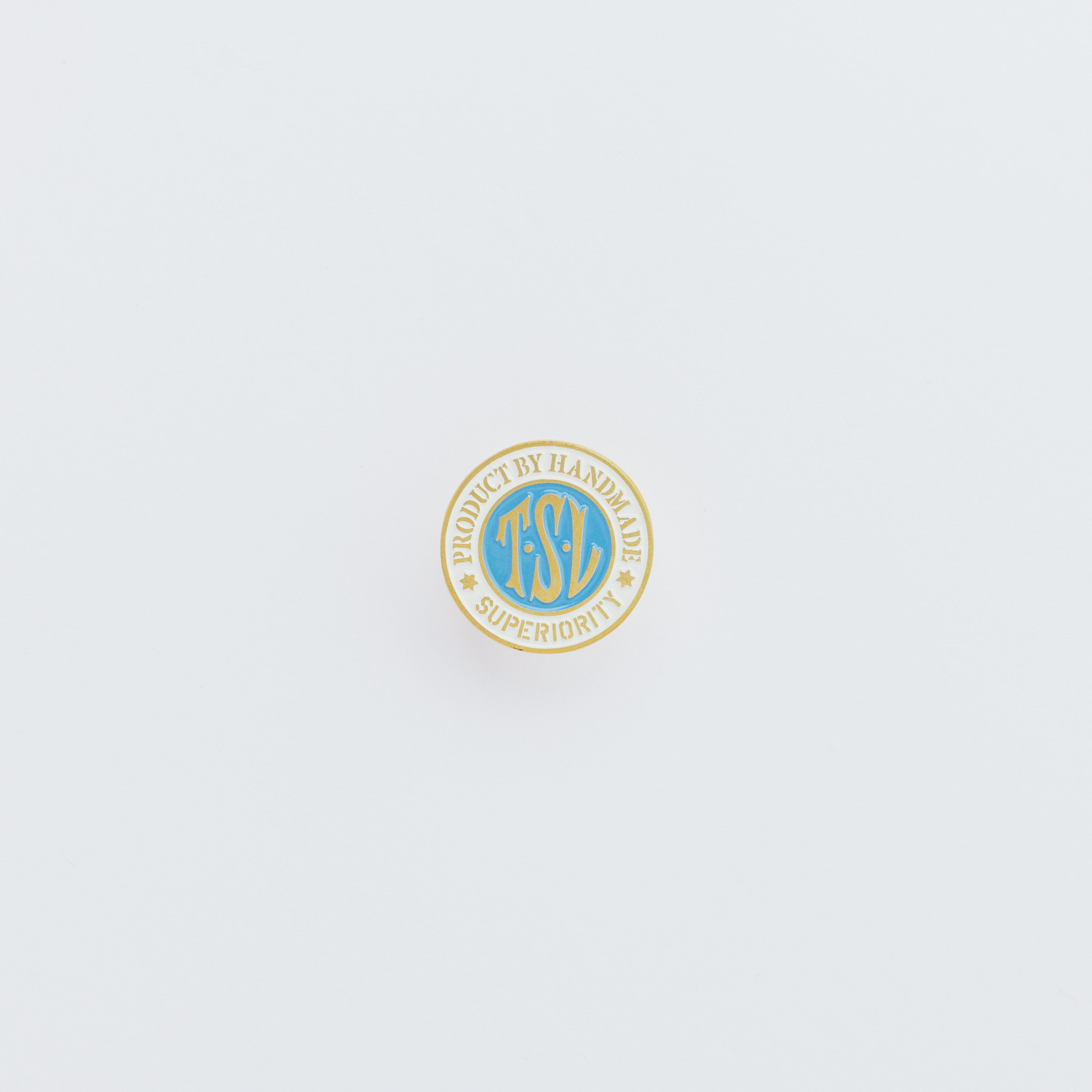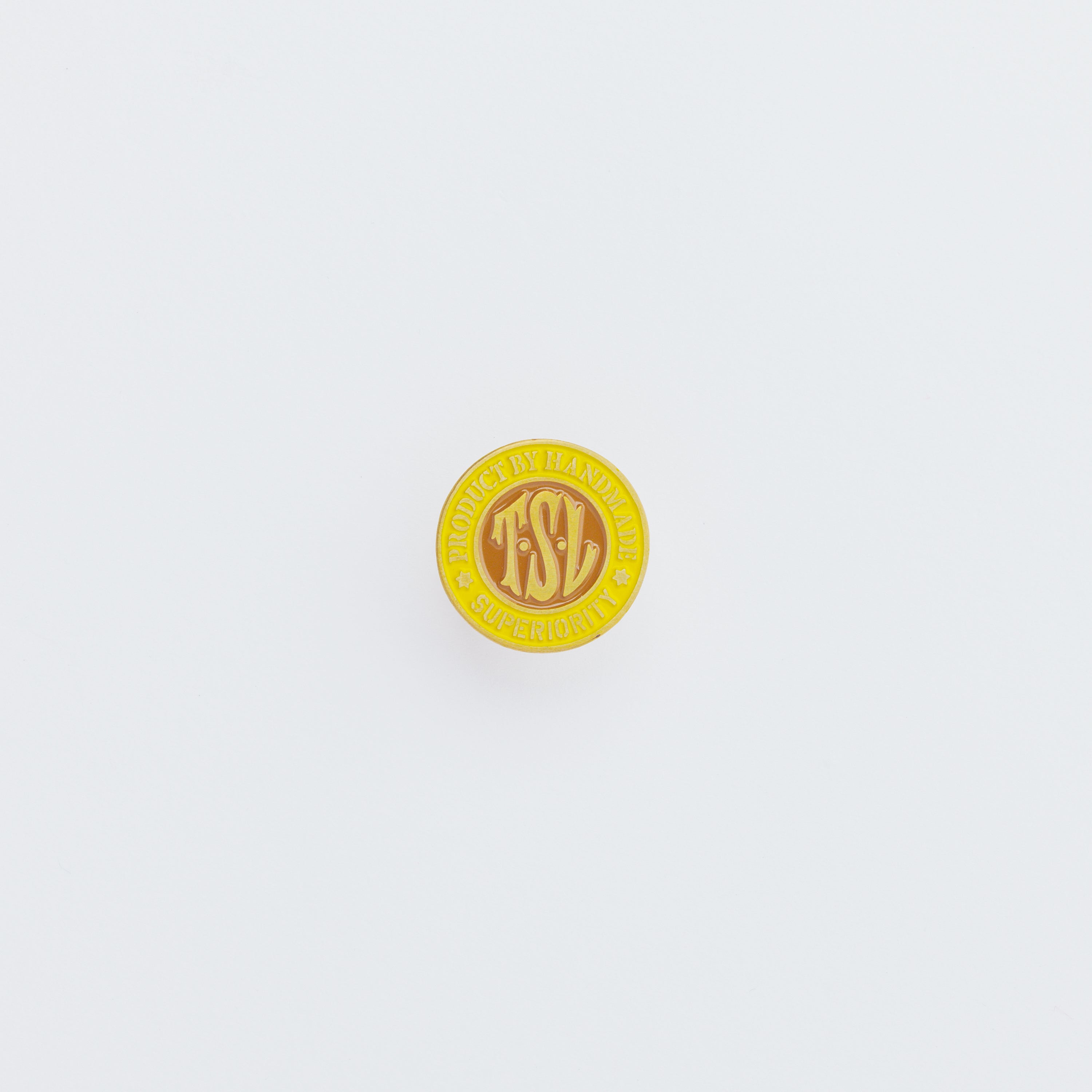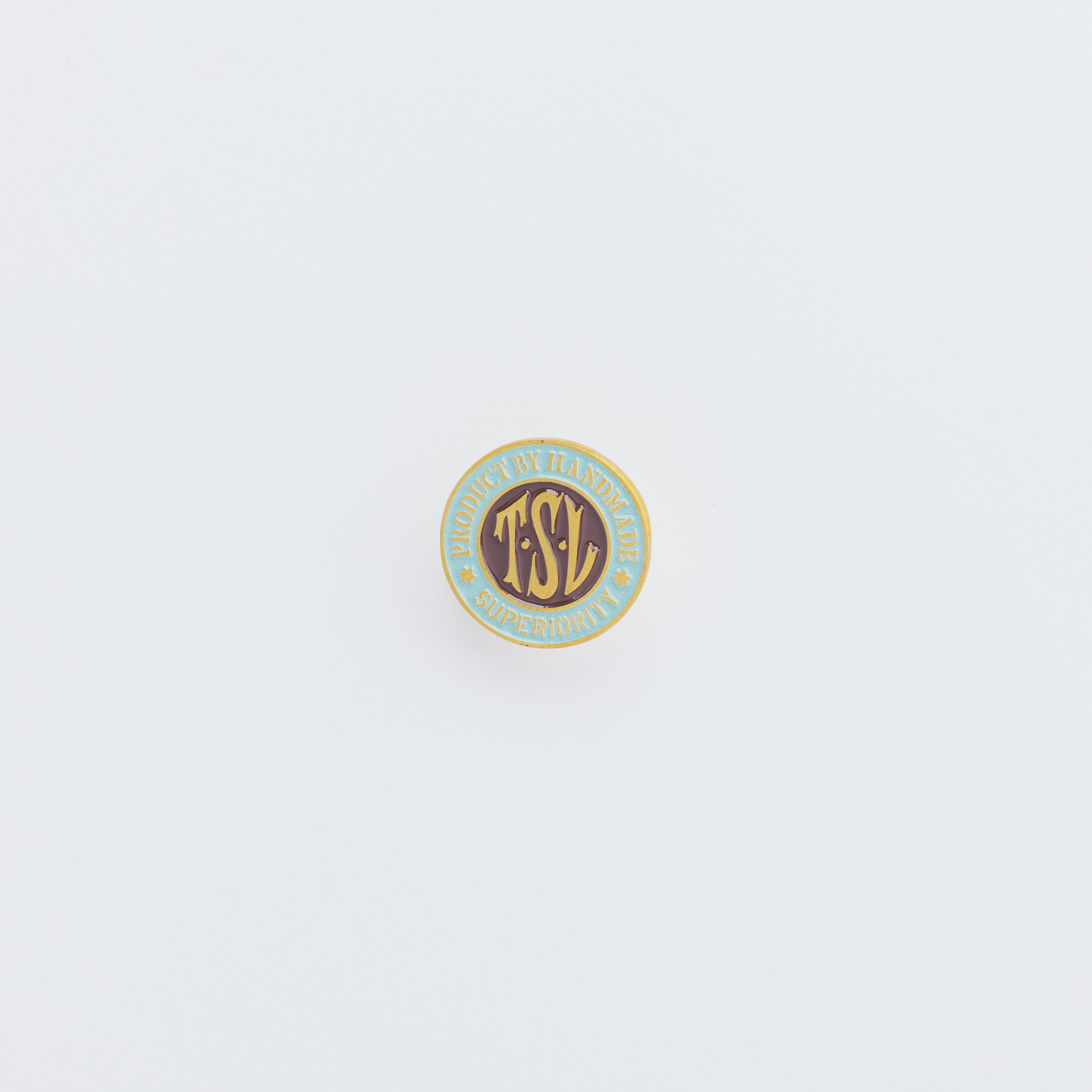 TSLロゴをかたどった、真鍮製のオリジナルピンズ。